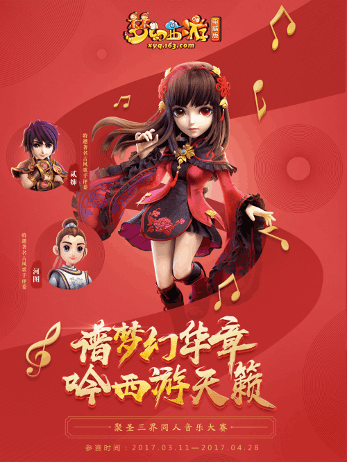 绕梁三日诉知音,高歌一曲醉风月。从《为爱追寻》到《恋西游》,从《入梦》到《回合》,每一首歌都能牵起无数《梦幻西游》电脑版玩家的无限遐思。3月11日,《梦幻西游》电脑版聚圣三界同人文化盛典之音乐大赛正式开启,让所有玩家都听到你的天籁之音吧! 寻找梦幻之声,聚圣三界同人音乐大赛正式开启 在经历了同人小说大赛和同人手绘大赛之后,现在,《梦幻西游》电脑版同人文化盛典最终站——同人音乐大赛终于拉开帷幕!从3月11日12:00起至4月28日12:00,玩家们可以前往长安城同人盛典仙子(225,123)处报名参赛,在《梦幻西游》电脑版在同人盛典专题页面上传作品参与比赛,并将作品压缩为MP3格式上传。用自己的天籁之音,表达对游戏的热爱,并将其分享给更多的音乐同好! 两大组别!梦幻心情你来演绎 为了能够让玩家各展所长,本次比赛总共分为翻唱专场和梦幻战歌专场。在翻唱专场中,玩家可以自由翻唱《梦幻西游》相关歌曲,官方也将在主题页面为玩家提供《为爱追寻》、《恋西游》、《入梦》、《回合》、《梦幻西游好想你》等原版NP3和男女版伴奏下载。 而在梦幻战歌专场中,玩家可以根据自己的梦幻战斗感悟,谱写属于自己的梦幻战歌。在此过程中,玩家可以用文字创作出梦幻战斗相关歌词,附上改编的歌曲名,按照指定格式上传到专题页面。也可以对战歌进行词曲创作,并用自己的声音演绎出来。 相信两大不同组别不同规则的赛事,一定能让每一个玩家尽情各展所长!