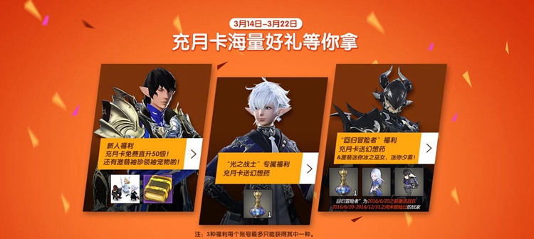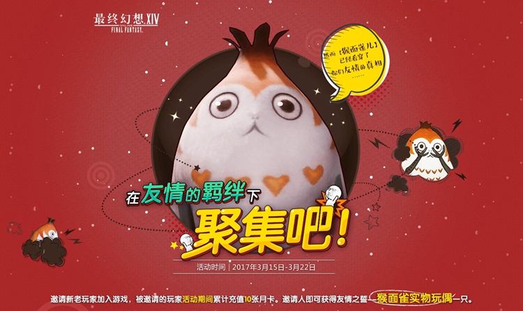 《最终幻想14》国服突破130万 完全免费疯玩3天 盛大游戏代理的大型正统日系MMORPG《最终幻想14》今日开启国服疯玩大福利,3月17日至3月19日完全免费,登陆即送游戏时长,快叫上小伙伴们一起疯玩3天吧! 【3天疯玩完全免费】 《最终幻想14》是史克威尔艾尼克斯开发的FF系列正统续作,国服此次为了感谢广大玩家的长期关注,开放有史以来最大规模的免费福利。 活动时间:3.17日0点-3.19日24点 1、活动期间内所有账号都是正式账号,包括新注册的账号,不受任何未激活前免费账号的限制,例如免费账号无法私聊、组队、加入部队、交易、使用邮箱等。 2、活动时间内每天首次登陆就将获得24小时的点卡时长,有效期保留至次日的2点,隔日再次登陆即可再次获得24小时赠送时长。 3、月卡用户优先会扣除月卡时间,所以我们会针对月卡用户进行单独处理。根据月卡用户的登陆情况补上对应天数,活动期间内登陆几天就赠送几天,最多3天,月卡天数将在活动结束后统计发放。(月卡赠送周期较长,建议耐心等待) 4、活动结束后,未使用完的赠送时间到期将清除。已激活(首次充值时长大于等于39元或者月卡)过的账号将保留激活属性,未激活过的账号将恢复为免费账号,超出35级将不会获得任何经验,金币超出30W将变为30W,相关被限制的功能也将继续被限制,激活时如果游戏在线,需要重新登陆才可变为正式账号。 5、新用户赠送的有效期为14天的30小时不受本次活动影响,仍可继续使用,活动期间内优先消耗当天赠送时间。 【拉新召回得猴面雀玩偶!】 在友情的羁绊下聚集吧,邀请新老玩家加入游戏!如果你是《最终幻想14》的“老司机”,那就可以邀请更多的小伙伴来体验游戏!被邀请的所有玩家在3月15日-3月22日累计充值10张月卡,邀请人即可获得猴面雀实物玩偶一个! 《最终幻想14》完全免费3天疯玩以外,官方还推出海量福利,3月14日-3月22日,无论你是“萌新小豆芽”、“光之战士”或者是“回归冒险者”,充值月卡即可获得海量好礼! 了解更多相关信息,请前往http://news.yzz.cn/ku/f14/ |