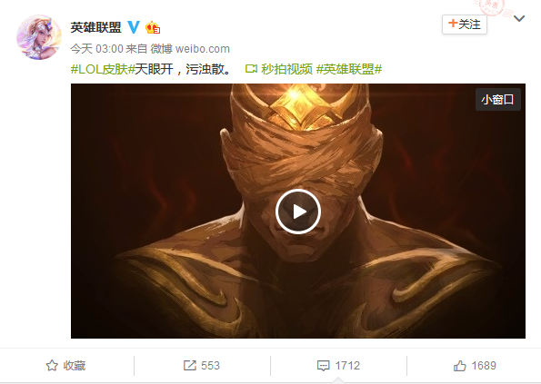 今日,英雄联盟官方微博发布了一款盲僧的-新皮肤预告视频,并佩文:天眼开,污浊散。