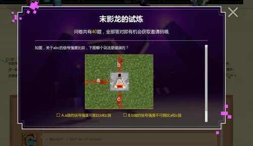 《我的世界》中国版自公布将在4月进行第一次小规模java版测试后,国内玩家关于游戏的讨论就没有停歇过。更别说3月24日首测邀请码活动正式开启后,求码的玩家络绎不绝,高呼真正“我的世界”即将来临,言语中难挡幸福之意。 作为《我的世界》真爱粉之一,小编已经和广大《我的世界》玩家在各大论坛社区针对如何才能参与测试展开深入讨论。接下来,就由小编来总结一二,让各位同样有志第一时间感受《我的世界》中国版的高人气魅力! 官网四大活动齐上线 各种玩家秀真爱 上周五,《我的世界》中国版官网同时上线了“神殿寻宝”、“末影龙的试炼”、“建筑大赛”和“精美留言”四大测试码预约活动。截止小编发稿之前,仅精美留言区就有441页玩家留言,,预计活动开启48小时内评论过万条。 从玩家的留言,我们不难看出,《我的世界》对玩家而言早已脱离了简单的“游戏”范畴。在《我的世界》这些年,他们在其中扮演了另一种完全不同的角色,体验了另一种完全不同的人生。他们享受“另一个家”的温馨,巩固与朋友的感情……在中国版来临之际,他们的 种种情感在此刻一并爆发。 在官方测试码预约活动中,引发玩家热议的非“末影龙的试炼”莫属。40道烧脑问答题让不少玩家直呼“太难了”,有玩家就表示:红石和指令我不会!,还有人开玩笑称“我认为我有必要去屠龙了。” 一时间,潜藏的各路大神玩家也一并出山,他们纷纷在社区论坛中秀出自己的通关截图和强势攻略,围观群众纷纷表示献上自己的膝盖。更多的玩家也因活动脱掉了“潜水党”的衣服,大家再度讨论自己的游戏初心和珍贵回忆:第一个夜晚、第一次屠龙、第一次和朋友玩生存…一时间小编感觉找到了当年第一次玩《我的世界》的新鲜感。 不能屠龙的冒险者不是真爱粉 究竟这次“末影龙的试炼”有多难,作为一个低调的“真爱粉”,小编这几天也是连续作战,终于攻克了40道题的难关,不由得感叹一句——题目真烧(bian)脑(tai)!比如下方这道题,小编也是一脸懵逼地研究了好久! 答案选项:( C为正确答案) A.a端的信号强度可能比b和c弱 B.b端的信号强度不可能比a和c弱 C.c端的信号强度可能比a和b弱 D.无法确定a和c的信号谁强谁弱 相信不少玩家都败在了这道题面前,小编就来说说自己的解题思路:图中是一个红石比较器,红石比较器有两种模式,图中比较器的前端红石火把是熄灭状态的,所以此时是模式一,也就是比较器模式,这个模式的特点是,当正面(c端)的信号大于或等于侧面(a端)的信号时,输出端(b端)的信号强度等于正面的信号强度,否则输出端的信号强度为0,图中可以看到输出端信号强度不为0,因此可以判断出,c端的信号强度大于或等于a端,而b端的信号强度等于c端,用公式表示就是b=c≥a。 因此A和B选项的说法显然是对的,D选项说法也是对的,因为c的信号不一定比a强,也有可能相等,而C选项的说法是错误的,因为c端的信号强度至少是等于a和b的,而不会比它们弱。 不过,以小编的经验,第一次答不对题也不要气馁,有些资深玩家也表示题目很难,大家不妨去网上多交流,人多力量大! 当然,此次也有属于“建筑党”们福利,只要参加以“中国”为主题的“建筑大赛”,在4月2日之前将自己的原创建筑作品上传至官网,即可参加大赛;获胜选手将赢得官方发放的邀请码一枚,作为此次大赛的优胜奖励。看到这里你是否和小编一样脑海中立马浮现各位大神的中国风作品呢?他们是否会借机推出自己的全新力作也让我们拭目以待。 如果上面的方法你都不太感冒,但是你会讲故事,那么这里还有一种方法提供给你:我们只需在精美留言区写下自己和《我的世界》最动人的故事、最美好的回忆,或者对游戏中国版最诚挚的祝福、最强烈的期待,被官方看到就会赠与我们邀请码呢! 听六路观八方 多平台助你快人一步 当然,为了让更多喜爱《我的世界》的玩家能够获得游戏首测的邀请码,网易游戏还与多个媒体平台合作,齐齐为玩家送福利。 在网易官方平台,除了在我的世界中国版官方网站参与活动,大家还可以关注官方微博@我的世界Minecraft、官方微信Minecraftgf举行的相关活动,也有机会获得邀请码。 可以说,虽然4月10日开放的只是小规模技术测试,但是我们广大玩家的热情可不会因此减弱。毕竟对于真心喜爱这款游戏的玩家而言,能感受正版体验,和小伙伴一起重温回忆,就已经是一件值得期待的事情。 了解更多相关信息,请前往http://pc.yzz.cn/ku/minecraft |