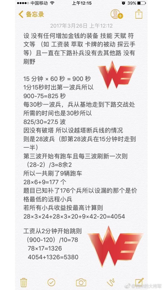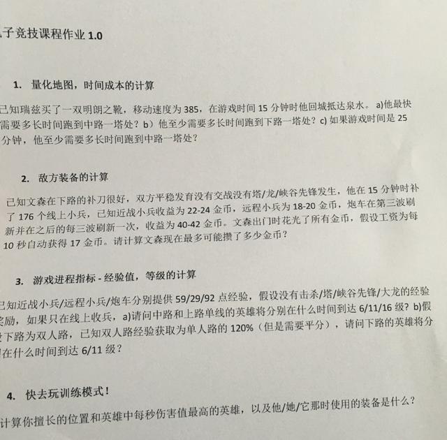随着国内外各大高校逐渐推出电子竞技专业后,不少“网瘾少年”奔走相告,似乎自己理想中的未来就近在眼前,不过职业选手和普通玩家的差距还是非常大的。近日,在武汉同济大学进修的职业战队WE选手“WE_957”曝光了《英雄联盟》专业课的作业,并在微博求助网友!废话不多说,下面就看看能把职业选手难倒的题目究竟有多难。 第一题还不简单?实在不行自己开把自定义试试不就知道了!