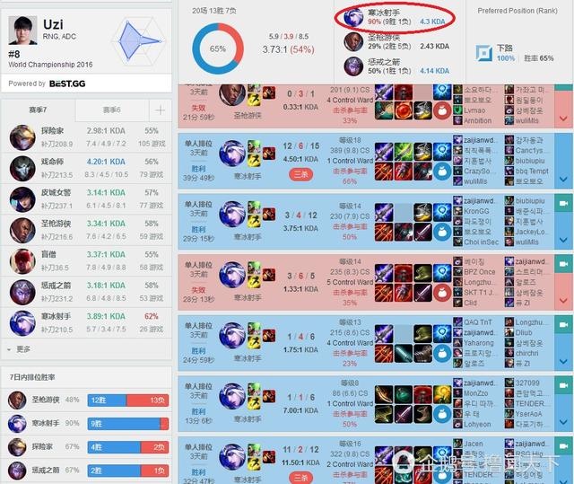 近日,我们熟知的《英雄联盟》职业选手小狗UZI在一天之内王者排位16场,使用一个450的英雄以高得离谱的胜率上到了韩服王者第五位! 如战绩图所示,UZI用的就是国服永久周免,价值450的寒冰射手艾希上到了韩服第五(截止14点),使用寒冰的战绩是9胜1负,90%的胜率确实高得离谱,可见UZI对艾希这个英雄的精通程度。另外,圣枪卢锡安最近使用也比较多,只不过2胜5负有点惨淡。艾希,就是UZI目前使用胜率最高的英雄。 UZI的寒冰射手艾希玩法:破败、飓风,血手是必出装备,看来想在韩服王者局立足,ADC的第三件装备就得出防御装血手了;另外,鞋子上的选择,也不是一味的出攻速鞋,而是根据局势的不同,uzi出的更多的居然是闪避鞋!这都是韩服高端局的排位套路,小伙伴们学到了吗? 另外,Uzi所在的RNG战队最近出现了不小的风波,原主力打野麻辣香锅没有出场,而是上的新打野。输给WE,艰难赢下VG战队之后,让观众们对RNG今年的走势也捏了一把汗。小狗可能感受到了压力,因此在韩服加紧排位练习,一天就打了16场排位。 |