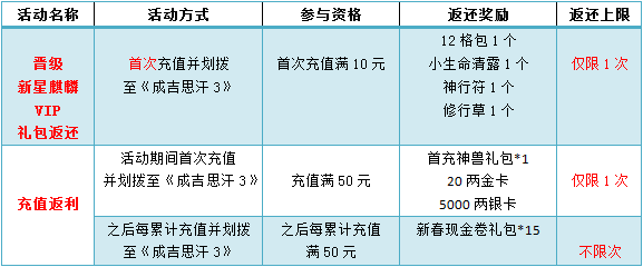 “万物生长此时,皆清洁而明净,故谓之清明。”今年清明节就要到了,《成吉思汗3》为玩家们准备丰厚的活动,踏青游戏两不误,超值礼包轻松领。 【充值送神兽 返海量金卡 银卡 新春现金卷礼包!】 活动简介: 倾情大放送!3月29日至4月5日,充值就送绝版神兽,20两金卡和5000两银卡,更有新春现金卷礼包不限量奉送!充值50即可获得首充神兽礼包1个、金卡20两和银卡5000两,之后每累计充值满50还能获得新春现金卷礼包15个!快去抢购绝版神兽吧! 除双线定制区特殊90级服务器,都可划拨本次现金卷礼包! 充值划拨满50两=50两现金+首充神兽礼包*1+20两金卡+5000两银卡 累计充值划拨满100两=100两现金+首充神兽礼包*1+20两金卡+5000两银卡+新春现金卷礼包*15 活动时间:3月29日09:00至4月5日9:00 活动规则: 温馨提示:首次充值指从未有过充值记录,从未将现金充值并划拨至《成吉思汗3》任一服务器的麒麟通行证账号。 开启“首充神兽礼包”,可以随机获得以下6种神兽中的其中一种: 充值返还范例: 温馨提示: 1、所有《成吉思汗3》玩家均可享受本次充值返还活动; 2、首次充值的玩家,只需充值累计满10元即可立即获得VIP特权,并获得“新星麒麟大礼包”作为返利,内含12格包*1、小生命清露*1、神行符*1、修行草*1等共价值9元人民币的实惠好礼!继续充值还可获得更多VIP特惠! 3、累计充值划拨额度,以玩家在充值后游戏内获得的实际现金数量为准; 4、部分使用神州行、声讯充值、短信充值等充值平台的用户请先确认游戏内获得的现金达到活动规则的累计额度,才能获得相应的返还奖励; 5、若活动期间,您将现金直接充值入指定《成吉思汗3》游戏服务器,等同于完成划拨,同样可以享受到对应的金卡优惠; 6、登陆充值中心,在【游戏礼包】选项中将相应礼包划拨至您所在服务器。 奖品领取: 所有奖励直接发放至充值中心,点击“游戏礼包”按钮将出现您获得的金卡返还,选择游戏大区和服务器,点击“分配礼包”按钮即可分配成功。 登陆《成吉思汗3》在王城找到“领奖大使”对话即可进行奖品领取。 《成吉思汗》系列感谢玩家们一如既往的支持。2017年《成吉思汗3》将给大家带来更多精彩,依旧是宽广辽阔的世界地图,依旧是热血激情的国战PK,经典玩法悉数保留,重温当年的岁月,重拾当年的初心,就在《成吉思汗3》! 关于《成吉思汗3》: 《成吉思汗3》是“最经典PK网游”《成吉思汗》系列2012年3月推出的最新续作,同样由国内网游金牌制作人尚进先生担纲制作,以“占地盘、抢老婆、玩后宫、集卡牌”四大特色玩法,引爆PK网游新巅峰。通过史诗剧情的继承与延展,《成吉思汗3》扩张6倍地图再现史上最辽阔疆域,更有全新6大职业强势登陆。《成吉思汗》系列产品深受千万玩家热捧,屡次摘得“最受欢迎网游”、“最受期待网游”等奖项。如今,《成吉思汗3》将把PK经典再推高潮,带来全新的地图和全新的感受。 不同于前作需花费大量声望或道具换取本职业更高级别装备的情况,续作中装备进阶消耗将大大降低,可直接将旧装备升级为新装备,同时保留装备所有养成。新装备不再需要重新升星、洗紫和铭刻。 了解更多相关信息,请前往http://han3.yzz.cn/ |