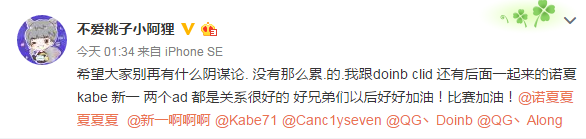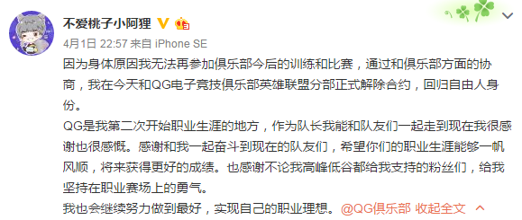 就在昨晚,《英雄联盟》QG俱乐部官博发布了一条微博,称现任辅助选手Ali与QG正式解约。 同时选手阿狸本人也表示自己的离开与诺夏无关,希望粉丝理智,不要被带节奏。 以下为阿狸微博原文: 因为身体原因我无法再参加俱乐部今后的训练和比赛,通过和俱乐部方面的协商,我在今天和QG电子竞技俱乐部英雄联盟分部正式解除合约,回归自由人身份。 QG是我第二次开始职业生涯的地方,作为队长我能和队友们一起走到现在我很感谢也很感慨。感谢和我一起奋斗到现在的队友们,希望你们的职业生涯能够一帆风顺,将来获得更好的成绩。 也感谢不论我高峰低谷都给我支持的粉丝们,给我坚持在职业赛场上的勇气。 我也会继续努力做到最好,实现自己的职业理想。 不过在阿狸的微博发出后,粉丝们对此产生了热烈的讨论,关于“阿狸是被诺夏逼走”的阴谋论更是甚嚣尘上。为了安抚粉丝情绪,阿狸再次发表微博,解释他的离开并没有什么阴谋论,队员们的关系都很好,并祝福QG比赛加油。 希望大家别再有什么阴谋论. 没有那么累.的.我跟doinb clid 还有后面一起来的诺夏 kabe 新一 两个ad 都是关系很好的 好兄弟们以后好好加油!比赛加油!今天早上,阿狸再次发表微博表示:自己的离开与诺夏无关,希望粉丝们不要被带节奏了,队员们关系都很好。 希望粉丝理智一点.我走跟诺夏没关系.我在跟队里跟诺夏关系很好.跟他一起打轮换 也挺轻松的 我们还会经常一起讨论辅助的问题.希望别乱带节奏了 让他好好打比赛 别影响他 还有别再带我其他队友的节奏了 我们关系都很好的 谢谢了! 事已至此,阿狸和QG之间虽已分道扬镳,但总归是好聚好散,我们也希望阿狸在日后的职业道路上能够越走越好。粉丝们也没有必要再去说所谓的阴谋论,或许这样对双方来说都是最好的结果。 |