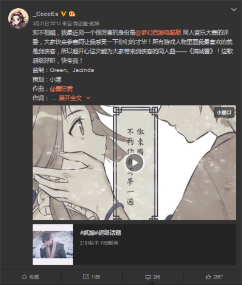 3月11日,《梦幻西游》电脑版同人音乐大赛正式拉开帷幕。作为本次《梦幻西游》电脑版聚圣三界同人文化盛典的重要组成部分,这一赛事在开启不到短短一个月的时间里,就吸引了无数玩家前来参与。除了玩家之外,最近,担纲本届同人音乐大赛评审的知名歌手贰婶也为大赛送上了自己创作的同人曲,期待能够以此,为更多朋友展示《梦幻西游》电脑版的魅力所在! 豪华评审团相邀!《满城雪》引粉丝点赞 为了能够吸引更多玩家参赛,《梦幻西游》电脑版也派出了专业评审团。在这其中,有对游戏本身有相当了解的《梦幻西游》电脑版研发团队,也有业内知名的原创歌手贰婶、古风歌手河图。 在最近,贰婶更是通过微博,发布了自己为本次大赛创作的最新歌曲《满城雪》。在微博上,他更是表示自己在游戏中最爱的角色是剑侠客,所以借着这次同人音乐大赛的机会创作出剑侠客同人曲,也希望更多有才华的玩家能为梦幻创作更多的优秀同人作品。 这首同人曲《满城雪》在贰婶极具磁性的嗓音演绎下,陌上少年的江湖心事被刻画得入木三分,在发布不久后,就成功登上了Bilibili音乐原创榜第一名,网易云音乐上的评论更是在一夜内吸引了1000条评论。 为梦而歌,梦幻玩家凝聚热爱唱出心声 《梦幻西游》电脑版同人音乐大赛现在已经正式开启。在不到一个月的时间里,就吸引了玩家们前来参与,秀出自己的天籁之音。 《回合》、《入梦》、《恋西游》、《为爱追寻》、《梦幻西游好想你》五大经典主题曲作为本次翻唱组指定曲目,在无数玩家的演绎之下,呈现出了鲜活的生命力。 在梦幻战歌专场中,不少玩家以原创词曲,演绎自己的梦幻情愫。在这其中,不乏惊艳之作。例如拥有天籁之声的梦幻版生命树以及玩家燃情创作的梦幻英雄谱,玩家们自己担纲作词作曲和演唱,在大赛中全方位展示自己的音乐才华,表达自己对游戏的无限热爱。相信玩家在欣赏这些优秀作品的过程中,一定也会与这些创作者有所共鸣。 丰厚大奖期待原创者!《梦幻西游》电脑版为君造梦 为了感谢玩家对这一赛事的支持和厚爱,《梦幻西游》电脑版也为玩家提供了丰厚的奖励。其中,获得翻唱专场的冠军玩家将获得梦幻手办一套、游戏表情智能蓝牙音响灯一个、年卡一张、专属称谓“同人音乐大赛冠军”以及万元现金大奖。此外,这一组别还设置了亚军、季军、第四~十名、人气奖等诸多奖项,获奖玩家将根据自己的成绩,获得不同档次的奖品。 而梦幻战歌专场则设置了填词大师和创作大师两大奖项,其中填词大师将获得梦幻手办一套、游戏表情智能蓝牙音响灯一个、年卡一张、专属称谓“同人音乐填词大师”以及万元现金大奖,而创作大师则将获得梦幻手办一套、游戏表情智能蓝牙音响灯一个、年卡一张、专属称谓“同人音乐创作大师”以及两万元现金大奖!值得一提的是:想要获得同人音乐创作大师的荣誉,需要采用完全原创全新的编曲编词,并提交由本人演唱的MP3文件。相信这一规则,一定能够吸引真正有才华的音乐大师,在这一舞台上,一展抱负! 4月28日,《梦幻西游》电脑版同人音乐大赛就将结束作品征集阶段。期待每一个玩家能够在此期间,为本次大赛献上自己的梦之声。现在,就请选择对应的组别,展现自己的才华,为自己的青春留下浓墨重彩的一笔吧! 了解更多相关信息,请前往http://xyq.yzz.cn/ |