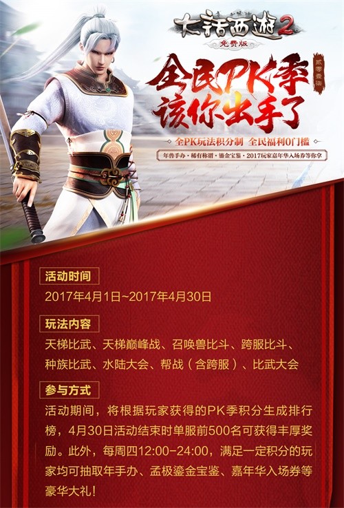 《大话西游2免费版》2017全民PK季火热激战中,今日起至4月30日,参与PK季相关玩法即可获得积分,赢取个性化称谓、2016鎏金宝鉴、凝魂珠(大)、八荒遗风等海量奖励!天梯比武火热今日打响,与旗鼓相当的对手一较高下,赢取奖励斩获积分!此外,新服【纵横三界】火热预约中,四大福利活动虚席待君至,邀你共赴三界江湖! 全PK玩法积分制 全民福利零门槛 大话2免费版2017全民PK季火热激战中,今日起至4月30日,诸位玩家参与PK季相关玩法均可获得积分,每周四12:00至24:00,满足一定积分即可参与随机抽奖(不消耗积分),有几率赢取珍藏年手办、2016鎏金宝鉴、2017玩家嘉年华入场券等豪华大礼! 根据积分生成天榜排行榜,5月1日至5月7日期间,单服排名前500的玩家可点击排行榜界面的“领奖”按钮获得排名奖励,领取个性化称谓和鸡驴手偶、大话一生画册、2017玩家嘉年华入场券等实物奖励以及凝魂珠(大)、龙之魄、八荒遗风、终极技能书残卷等丰厚游戏道具! 天梯比武今日打响 棋逢对手斩获积分 今日19:10至22:30,大话2免费版天梯比武火热打响,诸位玩家可前往金銮殿找到NPC徐茂公进入演武场,与旗鼓相当的对手一较高下,永攀天梯等级,赢取丰厚奖励!全民PK季期间,参与天梯比武还可获得PK季积分,可获得积分数为活动期间最高级别和胜点对应分数*70%。 了解更多相关信息,请前往http://dh2.yzz.cn/ |