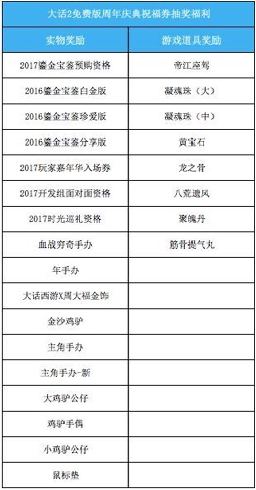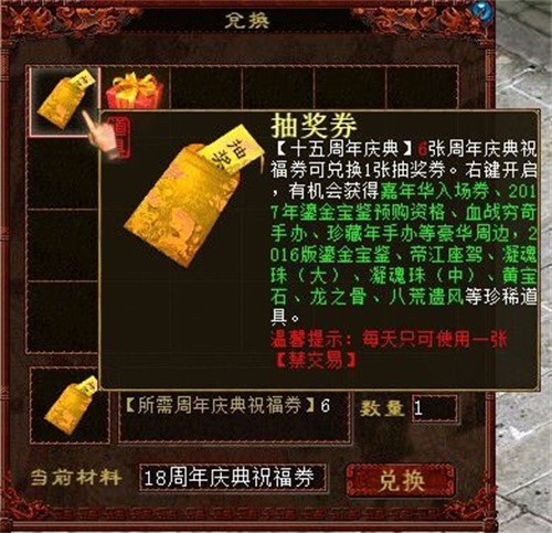 一款游戏,一生朋友!一年一度的周年庆典将近,《大话西游2免费版》推出特别福利活动, 参与即有几率获得周年庆典祝福券,可前往长安(278,182)找到NPC“十五周年庆典大使”,赢取2017鎏金宝鉴预购资格、2016鎏金宝鉴、血战穷奇手办等实物奖励以及帝江座驾、凝魂珠(大)、黄宝石等游戏道具奖励! 海量福利大放送 参与赢周年庆典祝福券 即日起至2017年12月31日期间,诸位玩家参与天道酬勤抽奖、全年节日活动的BOSS玩法即有几率获得周年庆典祝福券,每天12:00至24:00都可前往长安(278,182)找到NPC“十五周年庆典大使”,使用6张祝福券兑换抽奖券或者1张祝福券兑换师门贡献,每人每天可抽奖2次,可兑换师门贡献10次。 海量福利大放送 鎏金宝鉴、珍稀道具天天有 大话2免费版周年庆典抽奖券可抽取海量丰厚奖励,包括2017鎏金宝鉴预购资格、2016鎏金宝鉴、2017玩家嘉年华入场券、血战穷奇手办、年手办、大话西游X周大福金饰、金沙鸡驴、主角手办等实物奖励以及帝江座驾、凝魂珠(大)、黄宝石、龙之骨、八荒遗风、聚魄丹等游戏道具奖励! 了解更多相关信息,请前往http://xy2.yzz.cn/ |