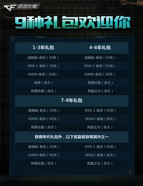 《穿越火线》(简称:CF)是由腾讯游戏代理的第二代FPS网游领军之作。作为一款全民竞技游戏,其完美地将个人技术及团队协作结合在一起,点燃了3亿鼠标的枪战梦想。从2007年开始,9年时间里,CF经历了由团队竞技模式发展至满足玩家多元化需求的14种游戏模式,从电脑端网游演变至双端枪战网游,人气更是急剧上升,迅速占领国内同类游戏领先位置,注册玩家数量突破3亿。CF更是在电竞行业投入大量的人力物力,从线上的线上挑战赛、百城联赛、高校联赛到顶级落地赛事CFPL,CF打造了一个完整的、专业的全民电竞体系,为中国电竞行业的发展贡献出了不可忽视的力量。 为回馈广大玩家的游戏热情,助力玩家再上火线,CF9周年序幕福利活动在今日重磅上线!4月13日至5月14日,CF为玩家准备了三重福利礼包和超多新版本内容,DSR-1 老兵(30天)、AWM-老兵(30天)、M4A1-战龙(永久)、凤舞云烟(永久)、凤凰之火(永久)、M4A1-S-大圣(30天)、金砖(永久)及黄钻VIP(1年) 等豪华礼包免费送给玩家,畅快枪战等待CF忠实玩家回归体验。 【寻找老兵 9重大礼等待玩家领取】 CF公测至今的9年时间中,始终以打造更佳的枪战体验为核心,以玩家需求为发展方向,在摸索与前进的道路上,CF不断推陈出新,新版本新玩法层出不穷,为玩家带来了一轮又一轮的枪战狂潮和欢乐。而这9年的成长,正是离不开无数玩家支持和鼓励,为了感谢玩家的游戏热情,CF9周年序幕福利活动推出寻找老兵,荣誉回归的首重福利,根据玩家的CF注册年限,发放对应的荣誉礼包和荣誉称号,共计9种荣誉礼包等待玩家前来领取。 活动期间,CF玩家只需登录活动页面,即可根据玩家的CF注册年限获得专属荣誉名片及荣誉礼包。其中礼包内容空前丰厚,除了大量30天、90天的武器,例如汤姆逊-老兵(30天)、AWM-老兵(30天)、DSR-1 老兵(90天)等之外,更是首次不限量发放多款永久性武器和高达1年的CFVIP及黄钻CIP。金砖(永久)、M4A1-战龙(永久)、凤凰之火(永久)、凤舞云烟(永久)、CFVIP(1年)、黄钻VIP(1年) 都将免费送给玩家。 【9周年约战 重返战场领好礼】 适逢CF9周岁生日,活动期间玩家每天任意加入一局游戏,累计游戏天数即可获得对应的活跃礼包,礼包内容十分丰厚。M14EBR-炎龙(7天)、M249 MINIMI-天羽(7天)、Barrett-耀龙(7天)、汤姆逊-老兵(30天)、狙击枪弹匣(30天)、雷霆道具卡(1张)、疯狂宝贝(30天)、高爆手雷-SS(30天)等给力道具等待玩家轻松收入囊中。累计达到9天的玩家更可以获得复仇者(7天)、M4A1-S-大圣(30天)、金蛇戒(永久),同样的游戏时间,更多的游戏欢乐,9周年约战,火线战场召唤玩家回归。 【登录CF掌上穿越火线 免费领取复活币】 除却以上两重福利礼包之外,CF准备的第三重福利则更注重操作的便捷性。玩家只需完成登录CF掌上穿越火线APP,进入活动界面,即可免费获得10枚复活币。 【全新战场 全新模式等待玩家再上火线开启征程】 游戏体验始终是CF的核心。在送出众多福利的同时,也将把CF4月新版本“全能枪王”带入玩家的视野。模式、地图及武器方面都进行新一轮更新;新增的全能枪王模式是一个全新的公平竞技模式,游戏中所有玩家的武器列表都是一样的。在全能枪王模式中,玩家只能通过击杀敌方来升级武器,整个过程中要经历步枪、狙击枪、散弹枪、近战武器等多种武器,以最终武器完成击杀的玩家,或单局时间结束时武器等级最高的玩家获胜。全能枪王模式的核心理念便是打造出一个绝对公平的竞技环境,英雄级角色和武器都将在这里禁止使用,玩家可以轻松体验到绝对公平枪战带来的快感。 新版本还增加了新沙漠TD(团队竞技)与经典沙漠-1 TD。老图新景象,这两张地图采用最新的制作技术,全新的布景材质,更真实的细节绘制,给玩家带来不一样的体验,让人眼前一亮。此外还有一张化学研究所(特殊战:爆头战)地图加入了新版本,此地图结构紧凑,具有宽广的战斗区域和高台,同时地图更有巨大致命化学池,让玩家能够身临紧张刺激的场景中。 武器是玩家的忠实作战伙伴,CF4月新版本也在武器方面进行了更新,为玩家带来了APR338-天鹰(狙击枪)、MP5K A41-天鹰(冲锋枪)和杰迪-玛蒂克-雄鹰(冲锋枪)等多款期盼已久的武器,更精美的机身,更轻便的重量,更巨大的威力等待玩家的拥有。一个全新的火线战场,玩家将拿起新武器,在这里重新踏上火线征程。 风雨九年,历“九”弥新。CF这个FPS网游巨人在迎来9周岁生日的同时,将借机发力,开启周年庆典福利活动,免费送出众多永久武器和给力礼包,在全能枪王版本迎接玩家的回归。 躺着、趴着、任何姿势看最新穿越火线资讯!掌上穿越火线官方手机APP,看视频、查战绩、玩竞猜、领道具超20个功能全天为您提供服务。新战场不离线哦! 关于腾讯游戏 腾讯游戏,全球领先的游戏开发和运营机构,国内最大的网络游戏社区。以“用心创造快乐”的理念,腾讯游戏通过在多个产品细分领域的耕耘,对多元化四大平台的打造,致力为玩家提供“值得信赖的”、“快乐的”和“专业的”互动娱乐体验。 腾讯游戏,用心创造快乐! |