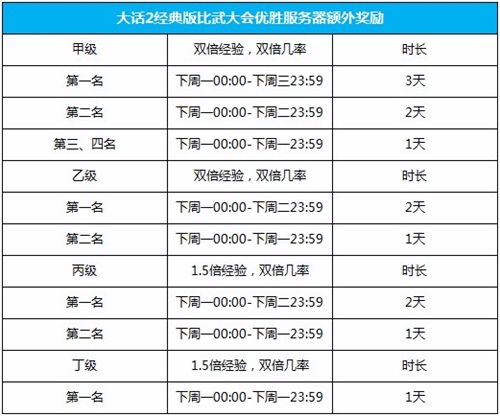 德才兼备,众望所归,方为最强!历经两天的激烈角逐,《大话西游2经典版》第46届天下第一比武大会暂告一段落,战报现已出炉,冠军名单如下:甲级冠军【剑烛沧海】、乙级冠军【天若有情】、丙级冠军【河北新区】、丁级冠军【六桥烟柳】,感谢所有参赛队伍为大家带来这一场热血沸腾的PK盛宴! 众望所归,方为最强!第46届比武大会战报 众望所归,方为最强!第46届比武大会奖励 经过硝烟弥漫的天下第一比武大会之后,诸位玩家赢得战斗的荣耀以及座驾奖励、优胜服务器额外奖励、特效设置、天宫寻宝等不菲回报! 1、座驾奖励:宝驹配英雄,何不天涯纵横! 甲级第一给每个ID奖励时效为30天的5人座驾-太音; 乙级第一给每个ID奖励时效为15天的5人座驾-太音; 丙级第一给每个ID奖励时效为15天的5人座驾-太音; 丁级第一给每个ID奖励时效为10天的5人座驾-太音。 2、优胜服务器额外奖励:部分服务器将在天下第一比武大会结束的下周开始获得相应时间的升级经验和召唤兽领悟几率提升奖励,其中经验加成在阿三、小鬼、天庭、鬼王、修罗任务中生效。 3、特效设置:优胜服务器在服务器选择界面会有专属特效。 4、天宫寻宝:甲级第一名服务器的参赛ID可以挑战BOSS“二郎神”,挑战成功后全服可开启“天宫寻宝”活动。 |