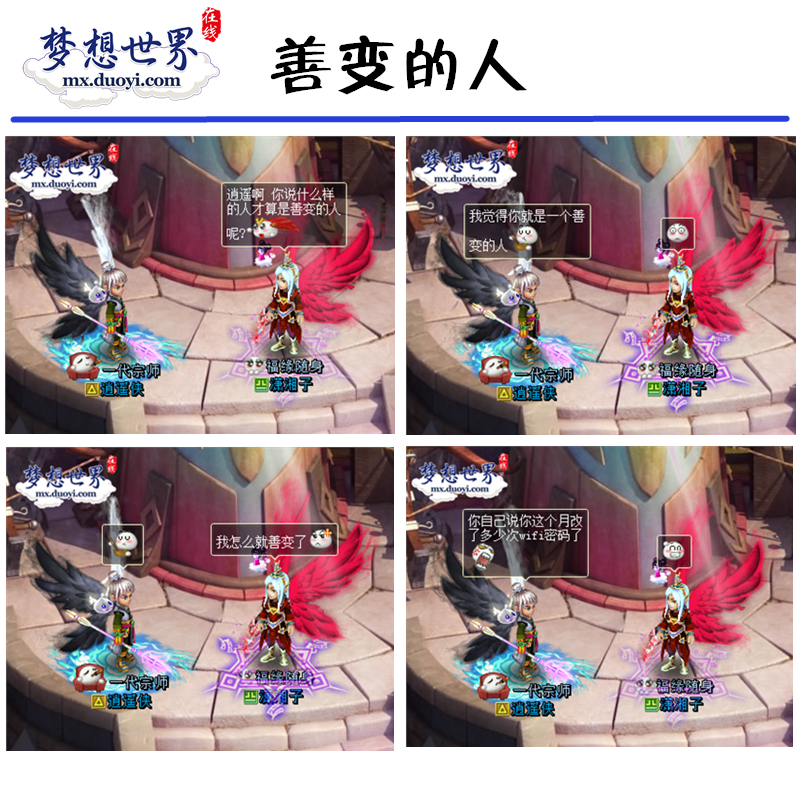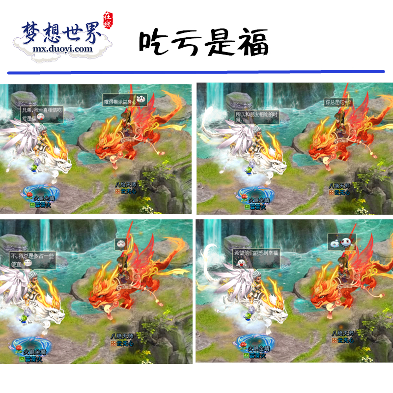 《梦想世界》全新内容“侠侣骑缘”今日开启,双人坐骑浪漫来袭。在侠客云集的梦想大陆上,偶尔也会发生一些有趣的故事。那些轻松搞笑的瞬间都会被玩家记录下来,成为了惹人发笑的四格漫画,玩家们个个都化身欢乐喜剧人。赶紧来一起看一看,最近《梦想世界》的世界里又发生了哪些趣事吧! 《梦想世界》新服推荐:春花秋月、情深谊长 善变的人 逍遥侠说潇湘子是善变的人,原来是因为... 把握时机 如何正确的批评女友,霹雳火终于聪明了一回 吃亏是福 霹雳火口口声声说吃亏是福,竟然是这样的“吃亏” 关于《梦想世界》 《梦想世界》是多益网络推出的高端回合战斗网游,拥有富有策略的战斗系统,11个流派421种招式,相生相克变幻无穷。独创电影式副本,带你穿梭古代未来,结交关羽,飞上太空战机械之王,探索超乎想象力的奇幻世界。随心打造个性角色,华丽翅膀、拉风坐骑、多彩光环、超萌小精灵等自由搭配。实时语音畅聊,结交游戏好友,遇上唯美爱情,一起闯荡武侠江湖。 了解更多相关信息,请前往http://mx.yzz.cn/ |