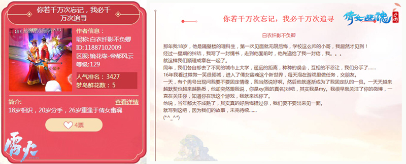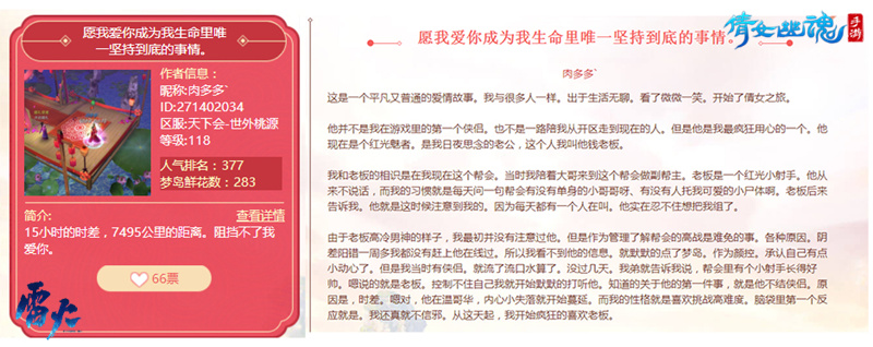 倩女幽魂手游情缘故事大赛现已圆满结束,近两万名玩家已经分享了他们的爱情。无论是青涩中透露着甜美的初恋,热情浓烈的追求还是细水长流的温情陪伴,在倩女幽魂手游中,他们的心一直在靠近。总有人戴着有色眼镜评价“网恋”不靠谱,然而爱情可以任何形式发生,无关现实,或是虚拟。在倩女幽魂手游的世界中,已经有无数玩家从擦肩而过发展到心心相印,甚至有勇气在现实中走到一起。没错,倩女幽魂手游代言人杨洋亲自领衔知名声优,在网易云音乐开设专栏,只为大家呈现真实发生在倩女世界中的浪漫爱情。 【杨洋领衔,讲述身边的倩女情缘故事】 自情缘故事大赛上线以来,官方已经收到了无数玩家的热情投稿。在阅遍万份爱情、学完千种套路之后,你是否会放弃相亲,全身心投入倩女手游的情缘大军,和侠侣认真谈恋爱呢?都说网恋套路深,可依然有很多人在第一次网恋时就遇到了那个能陪伴自己走完余生的TA。倩女幽魂手游代言人杨洋已在网易云音乐开设专栏,领衔知名CV,为大家深情讲述倩女中一段段不可思议却又水到渠成的爱情故事。 【精彩不断,知名CV说出真爱故事】 除了杨洋的语音节目外,众多优秀的故事也已经被改编成有声读物。倩女幽魂手游官方邀请诸多知名CV,共同为玩家打造倩女幽魂手游情缘故事分享平台已在网易云音乐上线。“有些人说不上哪里好就是替代不了”、“我们离永远只差一个回头”等在大赛中非常受欢迎的故事已经上线,更多精彩的内容正在陆续上传,敬请期待。 【无论形式 爱情会来到你身边】 现实的社会,房、车等硬性条件已经成为相亲的前提,相亲仿佛成了明码标价的一场交易。美国芝加哥大学一项研究结果指出,比起线下相遇的伴侣,线上相遇的情侣婚姻生活更幸福、离婚率更低。不少从线上走进婚姻殿堂的朋友们都表示,兴趣相投是婚姻的基础,见光不死的一定是真爱。缘起手游,圆梦倩女,这样的故事在情缘故事大赛里比比皆是。倩女幽魂手游官方将展示故事的真实一面,让杨洋等大咖亲口诉说玩家的爱情。没错,真正的爱情无关各种形式,无论是虚拟还是现实,只要你相信,就能在倩女幽魂手游中找到命中注定的TA。 新一代国民手游《倩女幽魂》是电视剧《微微一笑很倾城》虚拟世界架构方《新倩女幽魂》的官方手游,拥有端游级唯美画风与人设,传承经典玩法,男神杨洋倾力推荐!全新资料片“青丘桃缘”已经发布,美景与危机并存的青丘,全新新手系统,唯美时装坐骑敬请期待! 了解更多相关信息,请前往http://qn.yzz.cn/sy/ |