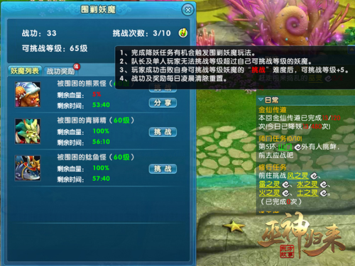 在《巫神归来》中,降妖的玩法一直深受大家喜欢,不仅能自己带神仙挑战,也可以与好友组队击杀妖怪,还能获得潜能、道行、宠物经验、九黎壶材料等丰厚奖励。 当然,这降妖任务可不只是大多人印象中的“捉鬼”玩法哦,降妖任务有机会触发围剿妖魔玩法,在指定地图中刷新妖魔,怪物触发后最多存在1小时。总共五个难度,当玩家击败与自身可挑战等级相同且难度为“挑战”的妖魔后,可挑战等级+5。 成功击杀妖魔后可以获得三界功勋、战功、道行,每日战功达到一定值还可领取其他奖励。玩家可以把自己的妖魔进行分享,分享后其他玩家可以前往击杀,也可以去抢别人分享的妖魔,从而一起获得更多奖励。 将游戏玩法与社交互动结合这么强的确实《巫神归来》的一大特色,是对传统的“捉鬼”玩法的革新与对经典的致敬。《巫神归来》新服【沧海月明】今日12点正式开启,赶快与约上好友一起来降妖除魔吧~ 《巫神归来》火爆公测,3分钟抓极品宝宝,神装换钱,日赚200,0元称爸!登录马上领588现金礼包:http://df.jzyx.com/home/ad/?ad_id=329398 了解更多相关信息,请前往http://dfgs.yzz.cn/ |