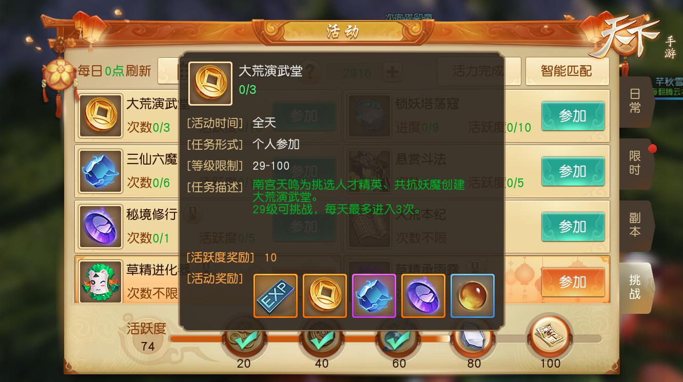 真3D极致画面,无缝大世界,网易顶级品质旗舰《天下》手游孩子系统即将暖萌上线,正太萝莉任性培养,更有召唤兽合体让你愈战越勇!武林之中,大荒演武堂的南宫天鸣前辈术法卓绝,数年来帮助王朝军训练,挑选精英共抗妖魔。大荒演武堂现已全新改版,少侠快前往比试讨教吧! 【新演武堂脱胎换骨 勇敢少侠定来挑战】 脱胎换骨,新演武堂再入大荒! 《天下》手游全新上线具有更丰富的关卡内容的新大荒演武堂,29级及以上的少侠可参与新大荒演武堂玩法,每天可进入玩法副本3次。 新大荒演武堂前30关为定制关卡,30关以后为随机关卡,挑战难度根据关数递增,有实力玩家可一直往更高层关数挑战哦! 【初始管卡设计超温馨 丰厚奖励等你拿】 全新演武堂每天初始关数根据上一天到达的最高关数计算得到,具体为上一天的最高关数减去随机数量(3-10关不等),所以少侠不必担心需要从头开始挑战! 演武堂奖励将于离开玩法副本时发放,奖励的丰富程度和本次挑战所到达的最高关数相关。若同一天第2或第3次挑战达到更高关数,将在离开副本时发放差额奖励,玩法奖励每天刷新。同时当挑战通过某些特定层关数后,可在玩法申请人处领取通关一次性奖励。 温馨提示,大荒演武堂排行榜将在每周一零点进行清榜,想要保持排名少侠要不断努力呦! 这天下,少年都在玩!大荒演武堂脱胎换骨全新上线,少侠快来比试锻炼自己吧! 了解更多相关信息,请前往http://www.yzz.cn/sy/tx/ |