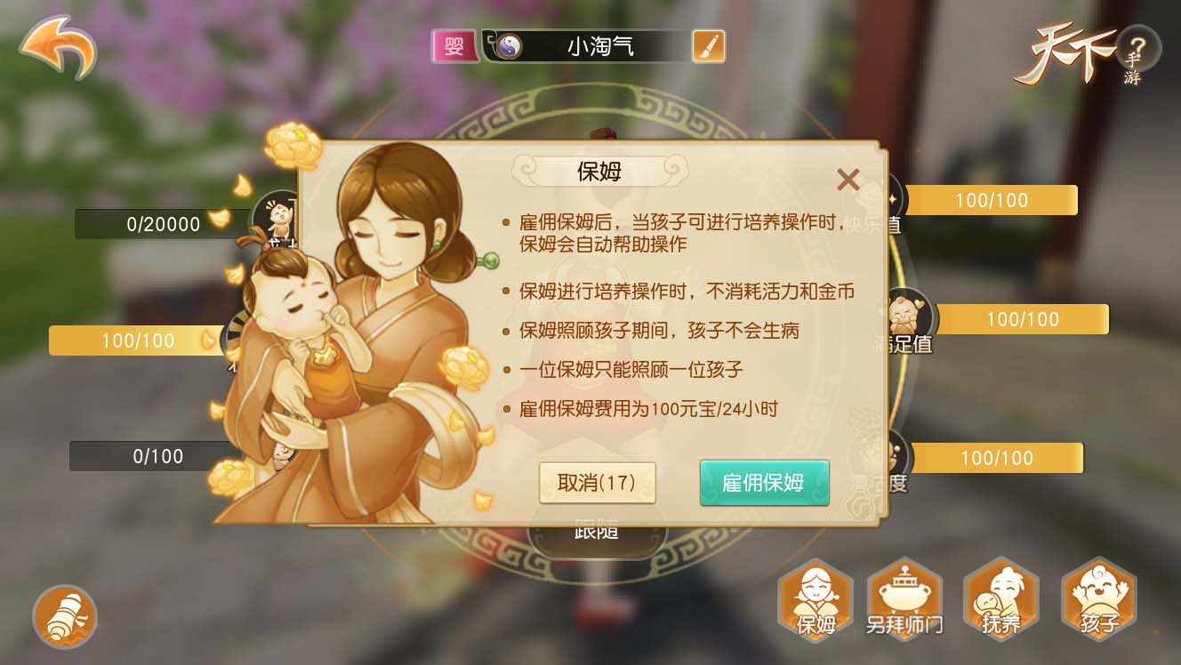 真3D极致画面,无缝大世界,网易顶级品质旗舰《天下》手游520天下热爱者告白季暖萌来袭,热爱一呼天下应,热爱者“念念不忘”新服5月19日火力开启!同时万众期待的《天下》手游孩子系统在于今天更新的版本中上线!情动大荒携手相伴,在线养儿育女不是梦想! 【线上养萌娃不是梦 辣妈奶爸其乐无穷】 在大荒已经有情缘的夫妻玩家,可以养育自己的小宝宝了! 子女养育分为胎儿、婴儿、幼年和童年几个阶段。在胎儿降世阶段,情缘夫妻需要满足双方等级都达到一定等级和好友度等基本条件后就有机会获得你们爱情的结晶啦!如果成功获得生育宝宝的机会,等待一周后便能收到宝宝出生的提示,每对情缘夫妻能养育子女的数量上限暂时保密! 如果少侠是单身贵族,并且短时间内没有成家打算,也想有一个可爱的宝宝该怎么办?达到一定等级的单身玩家,通过NPC一系列严格的考验之后,就能通过领养带着自己的宝宝回家啦!另外宝宝的性别和门派等大家关心的问题,少侠养娃时一看便知! 【实力培育熊孩子 带娃战斗更酣畅】 子女出生或领养之后,父母均可通过养育界面对孩子进行培养,逐渐提高小宝宝的能力。一个能力突出的宝宝,将会是父母行走大荒的好帮手哦! 在孩子的婴儿期具有满足值、洁净值,快乐值三项属性,通过培养操作可以增加孩子的对应属性值,三项属性值得平均值为孩子的状态值。当孩子的成长值达到20000时,孩子会自动进入幼年时期。 如果少侠太忙还可以雇佣保姆来帮忙照顾孩子呦!宝宝除了增强自己的修养和能力之外,还能为父母提供强大的战斗属性。将子女培育到一定阶段后,父母亲们就能带着宝宝去战斗了! 【天下热爱者告白季 念念不忘必有回响】 热爱一呼天下应,《天下》手游热爱者“念念不忘”新服将于5月19日全新上线,念念不忘,真爱必有回响! 520即将到来之际,天下热爱者告白季暖心开启!活动期间,只要少侠完成指定任务即有机会领取由《天下》手游送出的告白季礼物,beats耳机、永生鲜花珠宝礼盒、潘多拉手链等壕礼任性抽!更有召唤兽合体玩法、新版炫酷时装伏羲往事终章剧情等你一探究竟! 这天下,少年都在玩!遨游大荒新羁绊,正太萝莉齐培养!《天下》手游即将推出全新的孩子系统,更丰富的情节让玩家在游戏中乐享亲子时光, 了解更多相关信息,请前往http://www.yzz.cn/sy/tx/ |