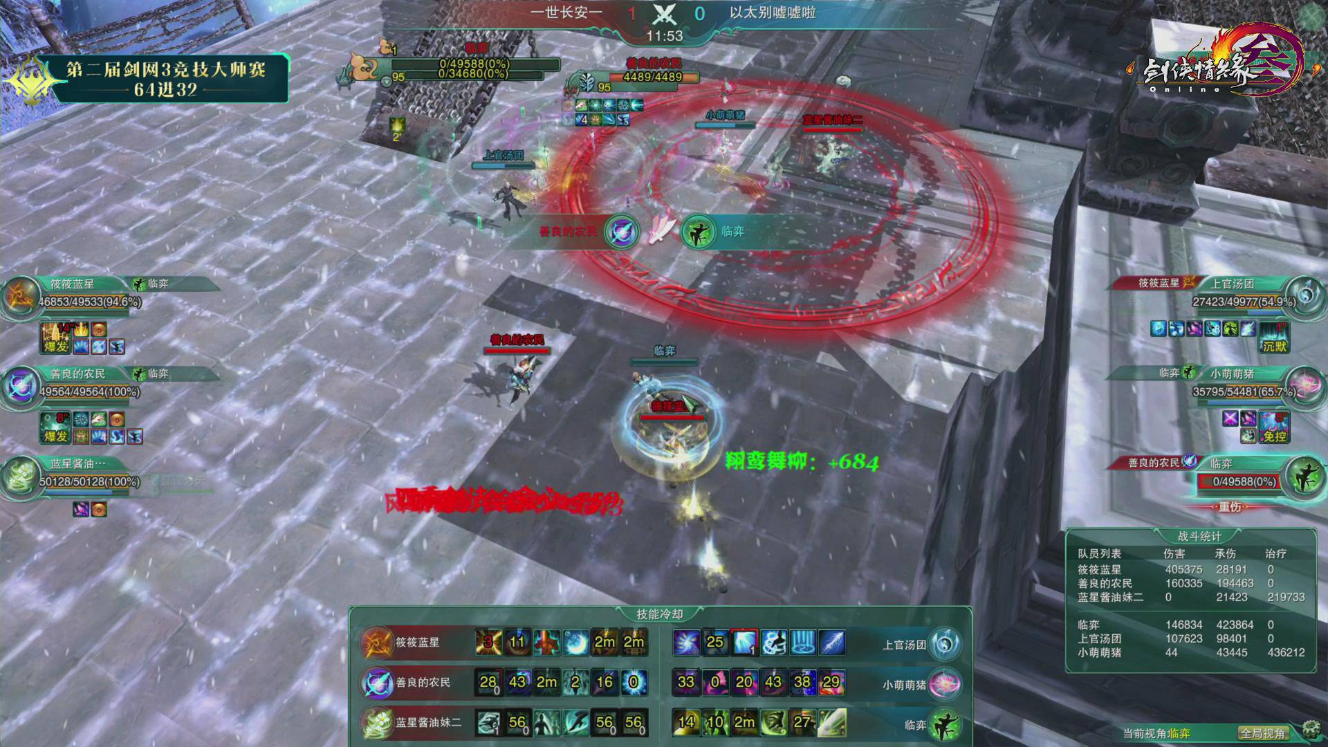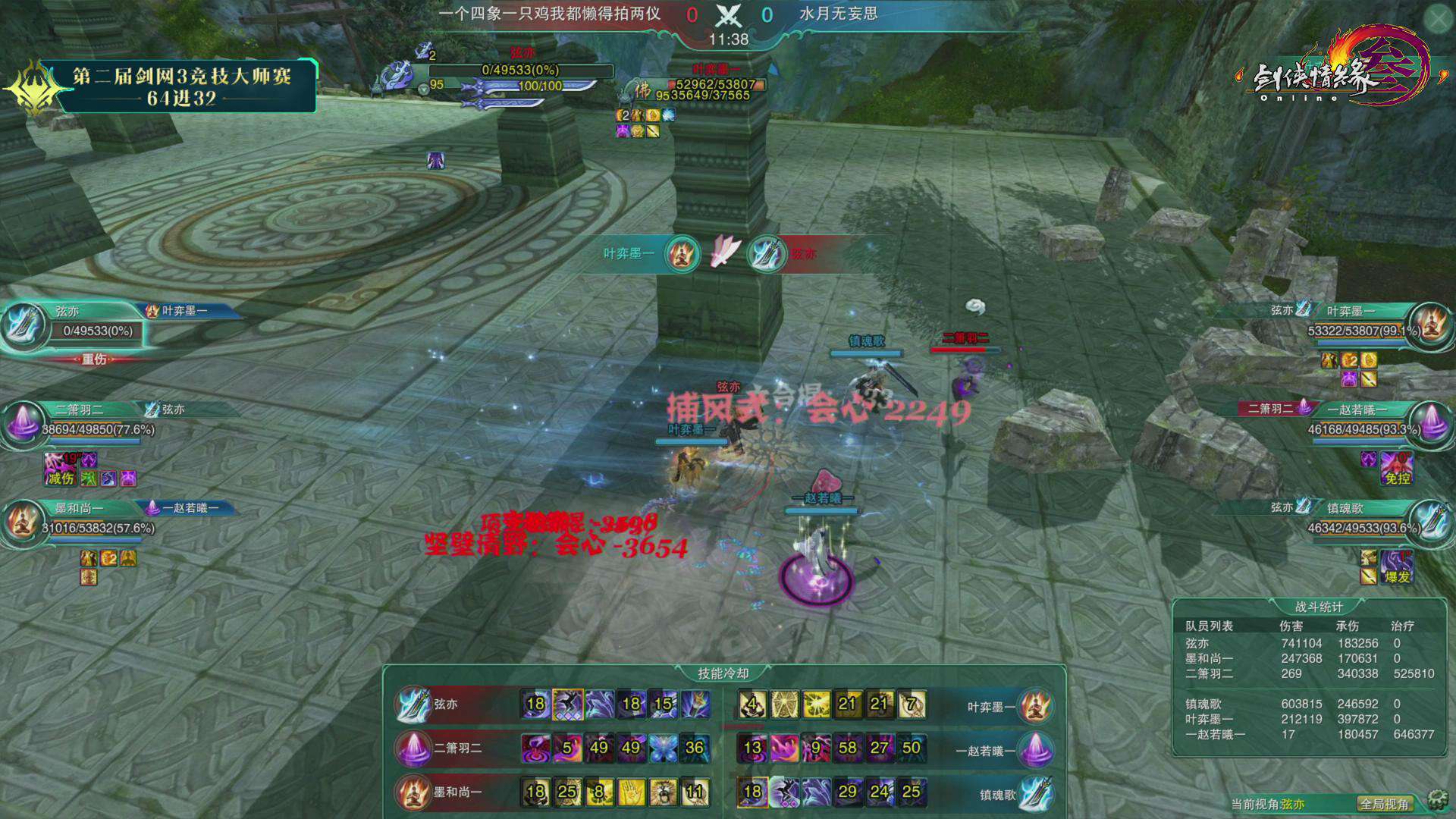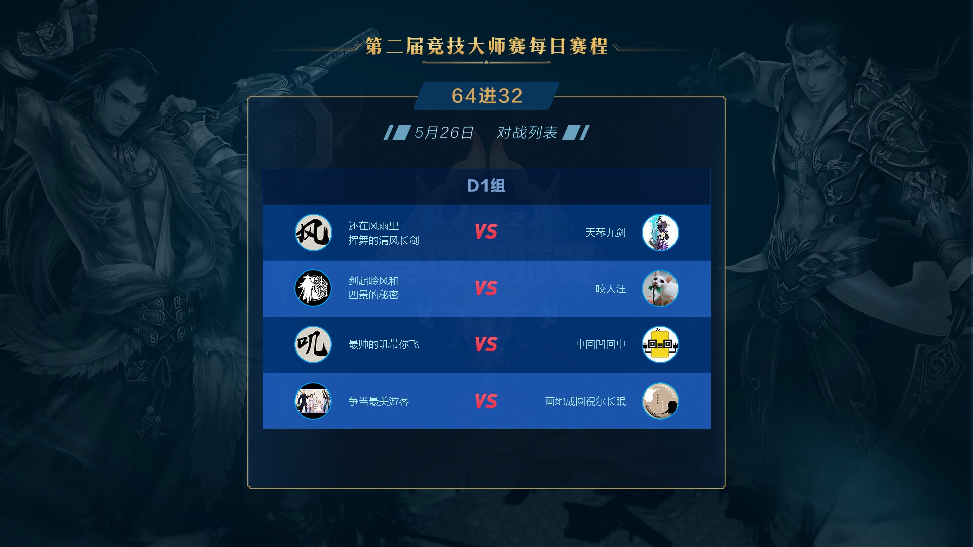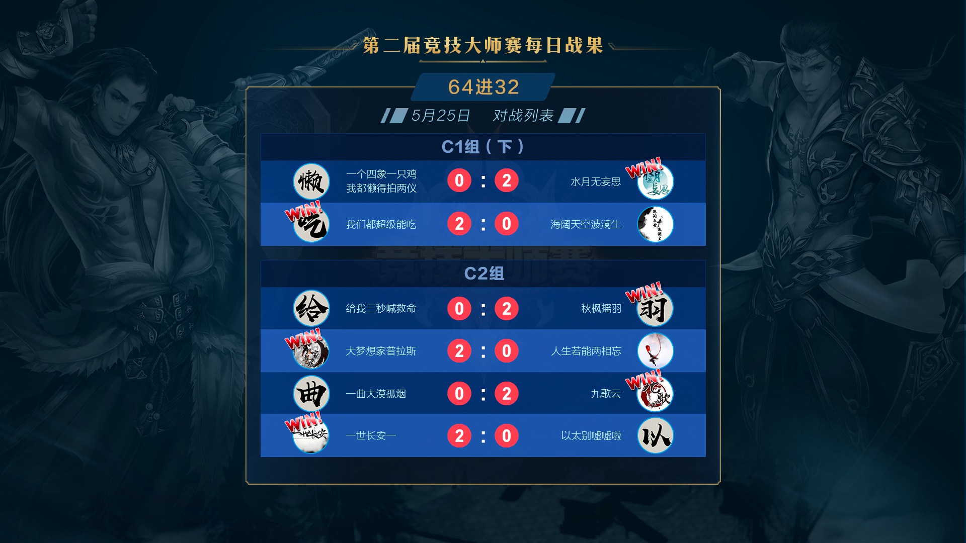 第二届《剑网3》竞技大师赛正赛5月25日迎来第四比赛日C1组下与C2组的争夺,水月无妄思、我们都超级能吃、秋枫摇羽、大梦想家普拉斯、九歌云、一世长安一六支战队成功晋级三十二强。下面一起来回顾第三比赛日的赛况吧! 5月25日战果: 第四比赛日依旧精彩纷呈,在各组对决中,面对双方压制混战的复杂局面,几次出其不意的突然转火爆发都成了垫定比赛基调的赛点。而在这些突如其来的复杂变化面前,几位治疗门派的表现也都成了左右比赛胜负的关键。 C1组 一个四象一只鸡我都懒得拍两仪(红)0:2 水月无妄思(蓝) 第一局 Banpick:相知/云裳心经 出战队员: 红方:墨和尚(易筋经)/弦亦(北傲诀)/萧羽(补天诀) 蓝方:叶弈墨(易筋经)/镇魂歌(北傲诀)/赵若曦(补天诀) 开场后蓝方强攻红方奶毒,抢珠地毯一波伤害将其打至残血。红队奶毒选择无惑奇穴,在全队血线崩塌的时候冷静蛊惑给自己,瞬发给队友,在近乎技能真空的时候依靠队友配合和冷静的抬血将血线维持了起来。不过虽然看起来险境求生,但是由于红方全程处于被动保奶之中被蓝方死死压住,且多次吃到群体伤害。最终红方霸刀处于长刀体态下由于没有解控被抓,被对方霸刀地毯加刀墙隔绝治疗后击杀。 第二局 Banpick:紫霞功/太虚剑意 出战队员: 红方:墨和尚(易筋经)/弦亦(北傲诀)/萧羽(相知) 蓝方:叶弈墨(易筋经)/镇魂歌(北傲诀)/赵若曦(相知) 开场后双方选择换奶策略,蓝方继续展现了强大的压制力始终将红方血线压制,最终成功击杀对方奶歌晋级。 我们都超级能吃(红)2:0 海阔天空波澜生(蓝) 第一局 Banpick:惊羽诀/莫问 出战队员: 红方:熊警官(易筋经)/日月劫(北傲诀)/糖喔喔(补天诀) 蓝方:罚罪(北傲诀)/君傲决(北傲诀)/是未呀(补天诀) 开场后蓝方双霸刀选择红方少林作为攻击重点,红队少林则对蓝方奶毒发起进攻,在迫使其走位后选择对方霸刀作为突破口,利用打断蓝方奶毒冰蚕3秒的沉默真空期成功压死蓝方霸刀。 第二局 Banpick:笑尘诀/焚影圣诀 出战队员: 红方:熊警官(易筋经)/日月劫(北傲诀)/糖喔喔(补天诀) 蓝方:假元宝(藏剑)/君傲决(北傲诀)/是未呀(补天诀) 开场后蓝方选择红方治疗作为进攻点,不过红方奶毒在面对对方集火时十分冷静,合理利用迷心循环缓解全队压力。随着时间进行,蓝方全队的治疗压力逐渐加大,最终由于奶毒没有选择女娲救急导致被击杀。 C2组 给我三秒喊救命(红)0:2 秋枫摇羽(蓝) 第一局 Banpick:北傲诀/云裳心经 出战队员: 红方:橘子大王(藏剑)/陈年雪祭(分山劲)/小停格(相知) 蓝方:秋叶无疯(藏剑)/叶叶叶叶叶杀(分山劲)/杨清羽(相知) 蓝方开场后选择一直强压红方相知,红方则希望通过攻击蓝方苍云缓解自身治疗压力。不过面对强压,红方相知始终无法摆脱纠缠断掉3层减疗,最终死在蓝方的大风车中。 第二局 Banpick:相知/分山劲 出战队员: 红方:橘子大王(北傲诀)/陈年雪祭(北傲诀)/小停格(云裳心经) 蓝方:阿枫枫枫(太虚剑意)/秋叶无疯(北傲诀)/杨清羽(补天诀) 开场后红方双方霸刀选择在对方剑纯、霸刀和治疗身上轮流转火,虽然制造过几次威胁但始终没有造成击杀点。而蓝方剑纯在成功摆脱掉对方压制后选择粘住红方奶秀,并在挂上五层叠刃后配合己方霸刀将其带走。 大梦想家普拉斯(红)2:0 人生若能两相忘(蓝) 第一局 Banpick:易筋经/北傲诀 出战队员: 红方:包菜菜菜菜(莫问)/小浅儿哥(焚影圣诀)/芙霜(补天诀) 蓝方:轻枭(分山劲)/凌凉(笑尘诀)/知淮(补天诀) 开场后红方莫问明教压制蓝方奶毒成功逼迫其交出千蝶,随后利用平沙及圈将红方队伍分割,明教继续黏住奶毒使其无暇治疗,而莫问则对已经半血的丐帮读徵成功击杀。 第二局 Banpick:补天诀/焚影圣诀 出战队员: 红方:包菜菜菜菜(莫问)/名濑结弦(北傲诀)/小浅儿哥(相知) 蓝方:青邱白烨(北傲诀)/易流年(易筋经)/知淮(相知) 蓝方开场后选择利用少林捉影抓人针对红方莫问和奶歌采用拉+墙的配合试图造成击杀点。红方则选择针对对方少林进行拉人双圈操作。多次交火后蓝方开始选择双双转火红方莫问,而红方莫问则利用良好的影子摆放位置,几次用平沙和影子来规避伤害险中求生,最终成功破坏对方节奏。随后莫问抓住对方奶歌追逐少林治疗的一次错位及时切剑转火奶歌造成击杀。 一曲大漠孤烟(红)0:2 九歌云(蓝) 第一局 Banpick:易筋经/北傲诀 出战队员: 红方:一醉浮笙(笑尘诀)/心无旁骛(分山劲)/画画画画殁(相知) 蓝方:温夜琅(分山劲)/满血你跑毛(北傲诀)/小小小浅(相知) 开局后红方选择丐帮8层拖住蓝方奶歌,苍云在奶妈支持下压制蓝方霸刀保护己方治疗。蓝方奶歌抗住丐帮纠缠并成功溜掉一次8层后,利用影子传送稳住己方霸刀血线。久攻不下之后,蓝方渐渐取得优势,苍云始终维持住红方奶歌的3层减疗并多次打断红方孤影后的放圈,最终成功带走红方奶歌。 第二局 Banpick:北傲诀/笑尘诀 出战队员: 红方:一醉浮笙(分山劲)/心无旁骛(惊羽诀)/画画画画殁(相知) 蓝方:温夜琅(分山劲)/风清歌(太虚剑意)/小小小浅(离经易道) 红方开场后选择鲸鱼风筝+压制剑纯,苍云则在剑纯和奶花之间转火的策略。但是由于苍云对奶花的骚扰并不持续,导致蓝方奶花的技能控制的非常好,始终没有太大压力。随后红方突然开始集火追杀奶花,多次将其陷于险地迫使蓝方交出技能保护。而蓝方在回援奶花后,也选择压制一波红方惊羽并突然对奶歌进