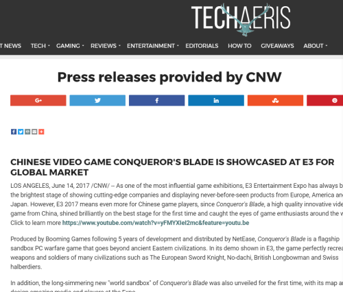 由网易旗下“不鸣工作室”打造,全文明战争沙盘大作《战意》正式登陆2017北美E3大展,全新版本惊艳亮相,迅速获得了现场玩家和国外媒体的青睐。在本次参展期间,《战意》展区人气火爆,试玩区更是聚集了大批外国玩家,好评声不绝于耳。 试玩上瘾,《战意》让“洋玩家”欲罢不能 在展会现场,大屏幕上播放的《战意》视频先声夺人,凭借高精画质与恢宏的战争场面迅速吸引了大量游客驻足观看,很快就激发了外国玩家的参与兴趣。令人自豪的是,这些常年接触顶级大作的海外高手对《战意》评价都相当不俗,认为它不仅在硬实力上达到了3A大作的水准,同时还拥有鲜明的个性风格,能够为游戏者提供不可替代的玩法乐趣。 整个试玩过程中许多玩家一上手便进入“根本停不下来”状态,沉浸在《战意》的游戏世界中无法自拔,更有大量玩家连续几日来到展区反复体验,成为《战意》在海外收获的首批死忠FANS。 全新版本,《战意》针对性打造超强体验 此次登陆E3大展的《战意》是根据外国玩家习惯重新设计界面的海外版,定名Conqueror’s Blade(征服者之刃)。多文明模式强劲开启,集东西方文明战争元素于一身,为玩家带来了真正的世界级征战体验。在该版本中,还出现了东洋野太刀、英国长弓兵、瑞士长戟兵、马耳他骑士等兵种。 在新版本中,《战意》的地图也得到了多角度升级,除了更加广阔的地貌地形之外,中世纪欧洲古堡主城的出现让攻城玩法更加丰富多变。同时,新版本的《战意》在画面表现力上也更加出色,无论是飞火流弹的擦肩而过,还是城墙崩塌时的地动山摇,都能让玩家体验到真实战场的凶险与激情。 好评如潮,《战意》打响“中国制造” 此次《战意》E3参展不仅俘获了大量海外玩家,更得到了国外游戏业内的关注与赞赏,被多家媒体竞相报道。不仅如此,《战意》还凭借过硬的游戏质量与惊艳的创意玩法让国际游戏领域重新认识了“中国制造”,自研引擎与中式元素从工业与文明两方面展示了当下国产游戏的风貌。 在著名科技媒体TECHAERIS、SMASHPAD、STEPARU等官方网站上,都纷纷出现了对《战意》在E3展会表现的详细报道。报道中不仅客观反映了试玩盛况,更热情赞扬了《战意》的专业品质,认为它已经可以与世界游戏大户美国、日本的作品相媲美,是“前所未有的优秀之作”。 随着全新游戏内容的曝光,《战意》在国服也将迎来终极测试。多文明军事力量的另类碰撞,中西方建筑与战役的逼真还原,《战意》诚邀英雄志士一起感受金戈铁马的厮杀快意,亲身经历权谋战术的翻云覆雨,开启比真实历史更恢宏的征战体验! 关于《战意》 《战意》为网易旗下“不鸣工作室”历时5年打造的创新战争游戏,为网易游戏年度战略级3D端游产品。 《战意》是一个把武将、兵团、器械玩法相结合的3D战争游戏。首创了ART动作模式,武将招式流畅,极富打击感。兵团种类繁多,技能特色鲜明,远近攻守,自由选择。战场地形丰富多样,可供施展战术策略。天气系统上线,利用气象争夺胜利。世界沙盘揭开面纱,广阔的战争世界等你探索! 了解更多相关信息,请前往http://news.yzz.cn/ku/zhanyi/ |