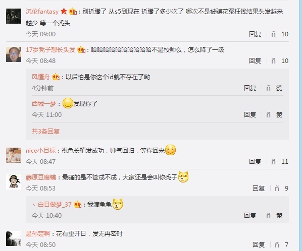 就在今天上午,LOL主播笑笑表示即将前往北京开始植发,还宣称在5天后当年的“级帅”将会回归。消息一出网友们瞬间炸开了锅,各种评论也是令人捧腹。 前几天,笑笑已经在微博上表示自己即将植发。 不过想起笑笑此前各种植发失败的惨痛经历,不少网友都劝他还是别去了。花冤枉钱不说,结果还糟心得不行。 此前笑笑现身某植发机构的照片也被网友曝光,并且这次以失败告终的植发也成了众多网友调侃的梗。 最终笑笑能否找回那头乌黑浓密的秀发,重寻当年“级帅”的自信呢?让我们拭目以待吧。 |