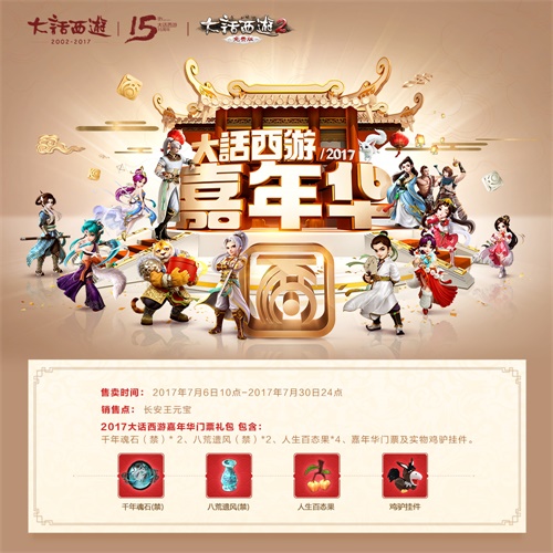 时光流淌,情义延绵,正如陪伴是最长情的告白,一年一聚已成为《大话西游》与玩家的无声默契! 8月12日至13日,坐标广州,大话西游2017嘉年华如约而来,福利满满的现场游园会、热血激燃的无差别总决赛、重磅爆料的品牌发布会、高颜值的coser表演……一场精彩无限的线下千人狂欢聚会等你参与!嘉年华售票今日火热开启,诸位玩家可按照指引前往对应版本的游戏中购买。 活动时间:2017年8月12日至8月13日 活动地点:广州市海珠区新港东路1000号广州保利世贸展览馆HALL6 3F 陪伴是最长情的告白 2017嘉年华精彩前瞻 精彩好玩,海量福利,尽在大话西游2017嘉年华,8月12日至8月13日,与你相约广州!现场游园会让你置身最熟悉的游戏场景,斗智斗勇换取积分,兑换限量周边好礼;无差别PK赛总决赛一触即发,顶尖战队巅峰对决,争夺冠军荣耀与20W现金大奖等海量福利;年度品牌发布会重磅来袭,最新最全的产品更新与品牌计划即将发布;高颜值coser团队突破次元壁,演绎大话情缘……更多精彩将陆续公布,敬请期待! 好兄弟,来一聚!大话2经典版玩家购票指引 7月6日维护后至7月30日24:00期间,等级≥3转的大话2经典版玩家可在游戏中的“多宝商城-综合-嘉年华”处购买2017大话西游嘉年华门票礼包,礼包除了嘉年华入场券,还包括小糖果*4、宝石精华*7、珍珠水泽丸药盒*2以及实物鸡驴挂件*1。 好兄弟,来一聚!大话2免费版玩家购票指引 7月6日10:00至7月30日24:00期间,等级达到2转以上的大话2免费版玩家可在游戏中的“长安NPC王元宝”处购买2017大话西游嘉年华门票礼包,礼包除了嘉年华入场券,还包括千年魂石(禁)* 2、八荒遗风(禁)*2、人生百态果*4以及实物鸡驴挂件*1。 好兄弟,来一聚!大话手游玩家购票指引 7月6日12:35至7月30日24:00期间,等级0转50级以上的大话手游玩家可在游戏中的“右侧奖励按钮-15周年庆典”处购买2017大话西游嘉年华门票礼包,礼包除了大话西游嘉年华入场券,还包括高级九彩云龙珠*60或神兽属性卡集或珍稀神兽卡集(概率三选一获得)以及实物鸡驴挂件*1。 |