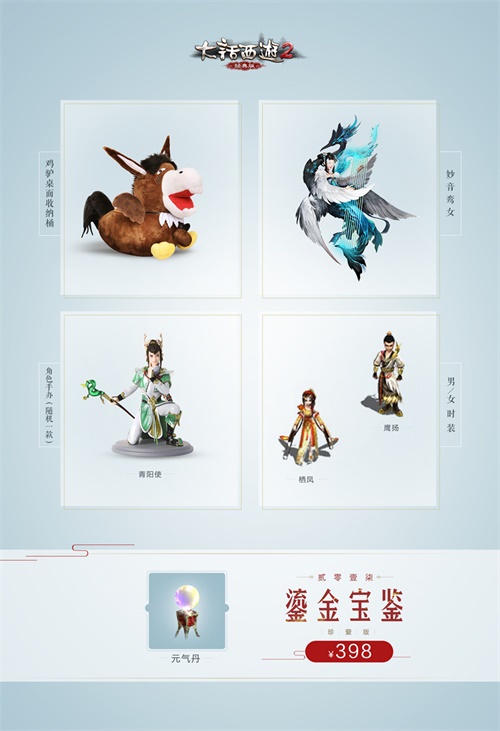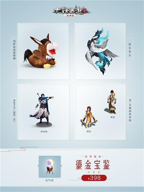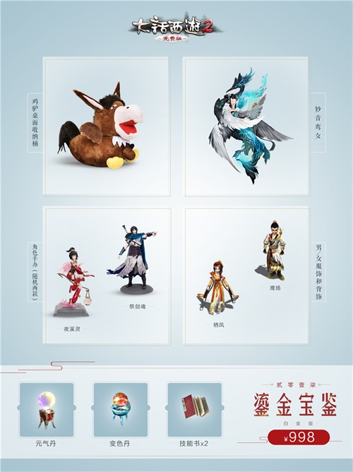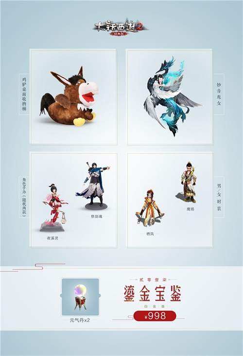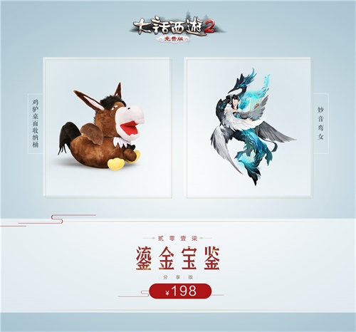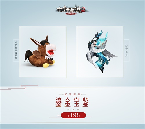 周年献礼,宝鉴出世!《大话西游2》2017鎏金宝鉴震撼登场,全新召唤兽“妙音鸾女”现身江湖,典藏版角色手办、鸡驴桌面收纳桶等周边惊艳亮相,更有时装、元气丹等珍稀道具来袭,第一批正式预购将于明日火热开启,快来比拼手速,抢购属于你的大宝鉴! 第一批预约购买时间:8月4日19:30至8月5日24:00 第二批预约购买时间:8月6日18:30至8月7日24:00 第三批预约购买时间:8月8日19:30至8月9日24:00 大话2经典版2017鎏金宝鉴各版本内容预览 周年庆献礼!大话2经典版2017鎏金宝鉴共有分享版、珍爱版、白金版三个版本—— 分享版售价198元,内含妙音鸾女一只、鸡驴桌面收纳桶一个; 珍爱版售价398元,内含妙音鸾女一只、妙音鸾女元气丹一个、永久时装一套(男:鹰扬,女:栖凤)、鸡驴桌面收纳桶一个、典藏版角色手办一个; 白金版售价998元,内含妙音鸾女一只、妙音鸾女元气丹两个、永久时装一套(男:鹰扬,女:栖凤)、鸡驴桌面收纳桶一个、典藏版角色手办两个。 大话2免费版2017鎏金宝鉴各版本内容预览 周年庆献礼!大话2免费版2017鎏金宝鉴共有分享版、珍爱版、白金版三个版本—— 分享版售价198元,内含妙音鸾女一只、鸡驴桌面收纳桶一个; 珍爱版售价398元,内含妙音鸾女一只、妙音鸾女元气丹一个、永久服饰和背饰一套(男:鹰扬,女:栖凤)、鸡驴桌面收纳桶一个、典藏版角色手办一个; 白金版售价998元,内含妙音鸾女一只、妙音鸾女元气丹一个、妙音鸾女变色丹一个、妙转乾坤与仙道无情技能书各一本、永久服饰和背饰一套(男:鹰扬,女:栖凤)、鸡驴桌面收纳桶一个、典藏版角色手办两个。 2017鎏金宝鉴召唤指南 一大波福利火热来袭 首波2017鎏金宝鉴福利抢先来袭,即日起至8月7日,诸位玩家可以扫描以下二维码,进入活动H5,将其分享给好友或者让好友帮忙收集,均可获得随机鎏金卡,集齐五张可合成大宝鉴召唤卡,使用有几率可以获得2017鎏金宝鉴(白金版、珍爱版、分享版)、鸡驴手偶、大话一生画册等丰厚奖励。此外,还可以将自己获得的鎏金卡分享给好友(大宝鉴召唤卡),见证彼此的友谊! 8月12日至13日,坐标广州,大话西游2017嘉年华狂欢开启,邀你情义一聚! |