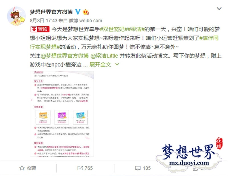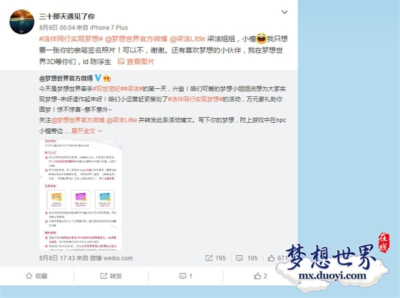 今夏最热播网剧《双世宠妃》主角曲小檀扮演者梁洁再次穿越啦!《梦想世界》迎来了属于梦想大陆的梦想小姐姐梁洁,梁洁专服“繁星点点”火爆开启!专属剧情、定制萌宠“点点”惊喜上线,还有梁洁签名照、海量周边、神兽奖励等你来拿!《梦想世界》系列特别开启的“洁伴同行,实现梦想”活动已经抽出了第一批获奖玩家,让我们看看大赢家是谁吧! 微博活动 实现梦想 《梦想世界》和“梦想小姐姐”梁洁为广大玩家带来福利啦!小姐姐要帮《梦想世界》的玩家们实现梦想!进入游戏后找到支线任务中的NPC小檀并截图合影,在微博中写出你的梦想并@梦想世界官方微博、@梁洁 Little,记得带上#洁伴同行实现梦想#话题,即可成功参与实现梦想的活动了! 洁伴同行 惊喜不断 活动期间每周《梦想世界》官方与梦想小姐姐梁洁都抽出5名梦想幸运儿、1名梦想大赢家,并且在活动的最后一天还将抽出1名大梦想家,赢得最高5000元现金的梦想,这么豪华的奖励让你心动了吗?那就赶快来参加吧! 繁星点点 定制萌宠 为了迎接梦想小姐姐的到来,《梦想世界》为各位少侠定制了梁洁专属萌宠“点点”。萌宠“点点”从玄灵大陆穿越而来,拥有非同于梦想大陆的气质,可爱软萌的大耳朵,小巧萌动的身形,无论你是不是梁洁的粉丝,“点点”都可以萌化你的心! 关于《梦想世界》 《梦想世界》是多益网络推出的高端回合战斗网游,拥有富有策略的战斗系统,11个流派421种招式,相生相克变幻无穷。独创电影式副本,带你穿梭古代未来,结交关羽,飞上太空战机械之王,探索超乎想象力的奇幻世界。随心打造个性角色,华丽翅膀、拉风坐骑、多彩光环、超萌小精灵等自由搭配。实时语音畅聊,结交游戏好友,遇上唯美爱情,一起闯荡武侠江湖。 了解更多相关信息,请前往http://mx.yzz.cn/ |