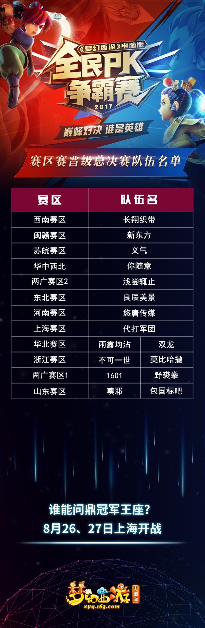 经过两个月的激烈角逐,激战了一整个盛夏,《梦幻西游》电脑版2017全民PK争霸赛总决赛终于要来了。在这个使人血脉喷张的夏季,脱颖而出的选手们也将迎来他们的大巅峰对决!8月26日,全国16强战队将汇聚于上海外滩W酒店,《梦幻西游》电脑版一年一度的顶尖PVP盛事即将开启! 【至尊荣誉!谁能登上冠军宝座?】 从“排位赛”到“进阶赛”上万支队伍的激烈战斗,到“赛区赛”192支劲旅的厮杀比拼,现在《梦幻西游》电脑版全民PK争霸赛16强战队已全部诞生。这16支战队分别来自于西南、闽赣、苏皖、华中西北、东北等12个赛区,每一支战队都可谓是身经百战,每一支战队也都是肩负着各自赛区的荣誉而战,群雄割据! 这十六支顶级战队将在8月26日至8月27日,亮相于《梦幻西游》电脑版2017全民PK争霸赛全国总决赛现场,上演巅峰对决!究竟哪支顶级战队能登上冠军宝座呢?让我们一同期待吧! 【重磅升级!精彩赛事平台同步直播不间断】 为了感谢玩家对本次全民PK争霸赛的关注,《梦幻西游》电脑版也为不能到场观战的玩家准备了丰厚的线上奖励。所有关注本次赛事的玩家都可以通过游戏内直播及时获知现场的一线资讯。届时,将有游戏内直播、官方微博直播、CC直播、网易资讯、斗鱼直播、熊猫直播、龙珠直播、触手直播等平台在8月26日8:30至21:35以及8月27日8:00至18:20对活动现场进行全天不间断直播。此外, 游戏内直播将开启人气战队竞猜、赛前阵型阵法竞猜、单场比赛胜负竞猜、等丰富多样的竞猜互动方式;关注官方直播平台,输入弹幕“梦幻西游真好玩,我们还要玩”还可抽奖,有机会获得超级泡泡公仔、超级神鸡公仔、神行小驴大公仔、游戏内超级神兽大奖等。在家看着直播就能够参与线上互动赢取丰富奖励! 【大饱眼福!众多Coser将与你近距离接触】 在这个属于3.6亿玩家的PK狂欢盛典上,将有4场与PK赛相关的Coser舞台剧供你欣赏,届时剑侠客、逍遥生、舞天姬、玄彩娥、英女侠、飞燕女、般若天女等Coser会在全场大巡游的时候来到你的身边与你近距离接触,还能与现场Coser亲密合影 【看点十足!七夕主题活动开启梦幻情缘】 本届全民PK赛全国总决赛举办期间,我们在现场将会体验更多的彩蛋。 彩蛋1:见证两位超级明星玩家进行终极打书对决; 彩蛋2:研发团队问答,与游戏策划面对面亲密交流; 彩蛋3:恰逢中国传统情人节七夕即将到来。为了庆祝这一特殊节日,8月27日下午,全国总决赛现场将开启神秘而又不失浪漫的七夕主题活动。这个七夕,就让我们牵手同游梦幻西游,在鹊桥之上秉烛夜游,承八月清风相依相拥;月下柳梢头,有你伴我。 万众瞩目的《梦幻西游》电脑版2017全民PK争霸赛全国总决赛就将拉开帷幕,本次PK赛现场将有众多“至尊观战团”成员将会来到现场,为自己所喜爱的战队加油鼓劲。未到现场的其他玩家也能通过各平台直播及时了解比赛现场盛况,一起参与各类竞猜活动来赢取丰厚的奖励吧,让我们一同见证新一届PVP至尊冠军的诞生吧! 记得全民PK赛我们一起“看着直播赢奖励”来看一下届时会有什么奖励: |