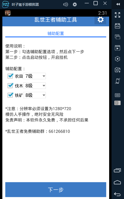 《乱世王者》是一款历史架空背景的战争策略游戏。游戏将策略玩法?与社交玩法结合,真实再现了诸多历史战争事件和画面,打造中国古代版的《权利的游戏》,实现玩家的霸主梦想。 叶子猪模拟器,让你解放双手,助你一统天下! 并专门对《乱世王者》手游进行优化,无论是主线任务、自动任务,还是武将招募、自动建筑、自动造兵、自动采集、自动征战、自动帮助,皆能够完美运行,满足玩家们的迫切需要。让你轻松惬意拿金币,一统天下指日可待! 【使用教程】 1,辅助器加载:在叶子猪模拟器开启游戏后,在上方的功能栏上选择“免费挂机”,耐心等待加载完毕。 2,在辅助器界面勾选想用的功能,点击下一步。 3,模拟器右侧会有一个浮标,点击启动即可自动收取资源。 叶子猪模拟器官方交流群:272609065 叶子猪模拟器下载地址:http://downtool.yzz.cn/php/dl.php?id=lswz 了解更多相关信息,请前往http://sy.yzz.cn/lswz/ |