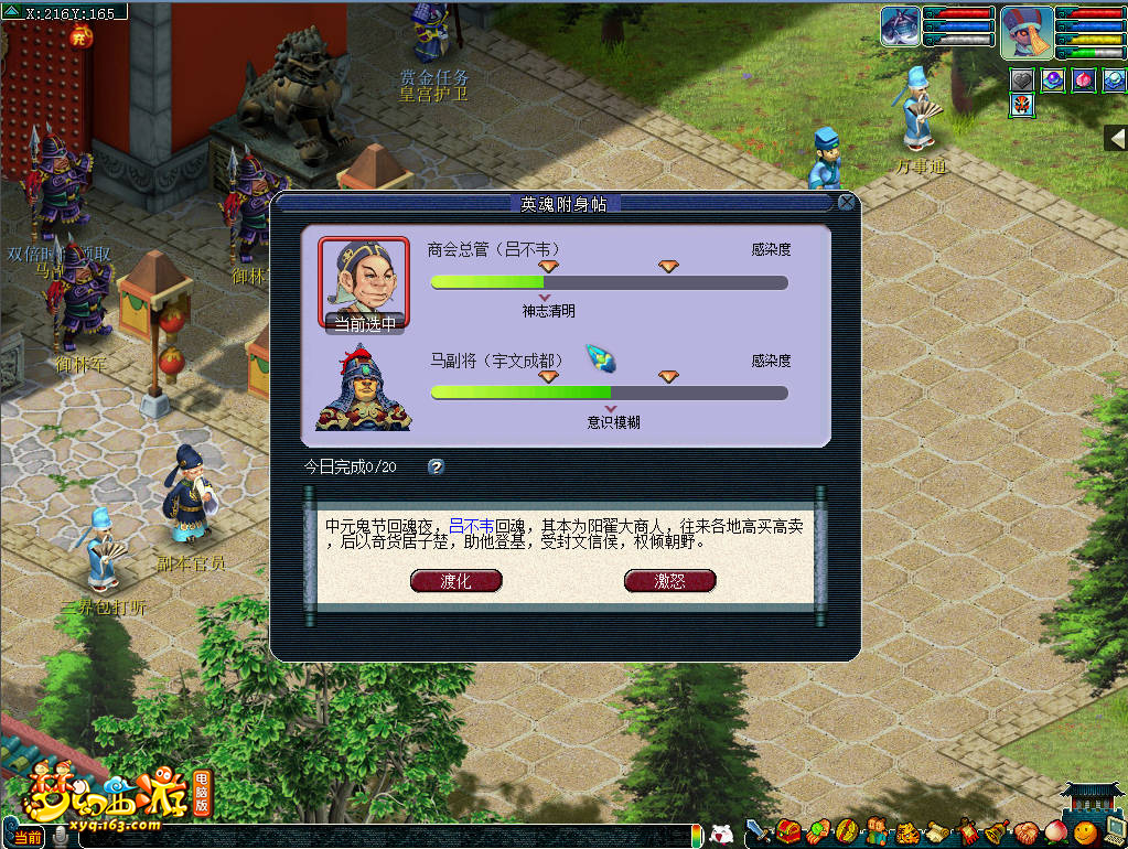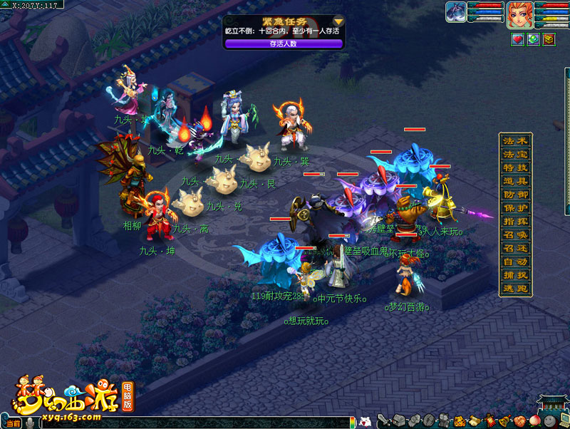 鬼门开启,猛鬼到来!随着中元节的到来,《梦幻西游》电脑版中元节主题活动也已经拉开帷幕!从9月4日—9月8日,五大中元节特色活动将在《梦幻西游》电脑版和《梦幻西游》口袋版正式上线。中元节来了,各位玩家快来《梦幻西游》电脑版抓鬼吧! 【僵尸大作战:两大阵营谁统三界】 作为每年中元节的保留节目,僵尸大作战再次如约而至。在活动期间,等级≥30级的单人玩家可以在长安城(261,97)寻找僵尸王,加入僵尸阵营,或者到长安城(360,250)找到茅山道士进入道士阵营,并学习两大阵营专属技能。玩家只要对不同阵营的其他玩家使用专属技能,就能够获得一定的战绩值,而提升战绩值则能获得更高等级,解锁更多专属技能。 在这场僵尸vs道士的大战中,哪个阵营能够压倒另外一方呢?我们尽管拭目以待! 【捉鬼竞速赛:擒拿恶鬼谁可争锋】 随着中元节的到来,一向在地府工作的钟馗也来到了朱紫国,邀请三界勇士帮助其擒拿恶鬼。在活动期间的每天12:00—13:00、15:00—16:00、19:00—20:00。等级≥30级的玩家只要3人或3人以上组队,就能前往朱紫国(104,63)钟馗处参与捉鬼竞速赛。在比赛期间,系统会记录玩家成功捉鬼的个数,成绩优异者则会被计入排行榜。在活动结束后,排行榜上前50名的玩家将获得丰厚物品奖励哦! 【冥城渡英魂:旧日英魂谁能超度】 在中原回魂夜,英魂吕不韦和宇文成都也在商会总管和马副将身上回魂。英魂的魂力吸引了无数僵尸前来,而道士们也发誓要倾尽全力保护英魂。围绕着英魂,两大阵营也再起波澜。 在活动期间,等级≥30级的单人玩家可以前往长安(230,119)中元老人处领取英魂附身帖,以获得任务。其中僵尸阵营的玩家可以激怒商会总管或马副将,增加英魂感染度,而普通玩家和道士阵营玩家可以渡化他们,降低英魂感染度。 需要注意的是:当英魂的感染度>1200时,便会“尸毒入体”,与之对话的人都有可能会被释放“尸毒术”,英魂还会在每个整点向当天完成了20个任务的僵尸发放战绩。反之,若感染度<600,变得“神志清明”,与之对话的僵尸都有可能被释放“降妖咒”,英魂会对当天完成了20个任务的道士发放战绩。所以,想要获得更多战绩的玩家千万不要错过这一活动哦! 【乾坤定猛鬼:猛鬼来袭谁应战书】 随着鬼门的开启,一些猛鬼也趁势重现世间。为了维护三界和平,中元老人邀请三界侠士前来平定猛鬼。在活动期间,等级≥50级的玩家只要5人组队,即可领取难度任务“乾坤定猛鬼”。在这一活动中,玩家要先后经历雨师妾、帝辛、九头三大难度战斗,谁能战到最后,拯救苍生呢?这就有待玩家自己来挑战了! 除了以上的四大中元节特色玩法外,在活动期间,玩家还可以每天登陆《梦幻西游》口袋版,参与“口袋堪舆”活动,其中包括了每日签到、风水罗盘、僵尸作战等一系列的节日小活动,在今年中元节,相信每位玩家都能够在梦幻西游获得满满的游戏乐趣! |