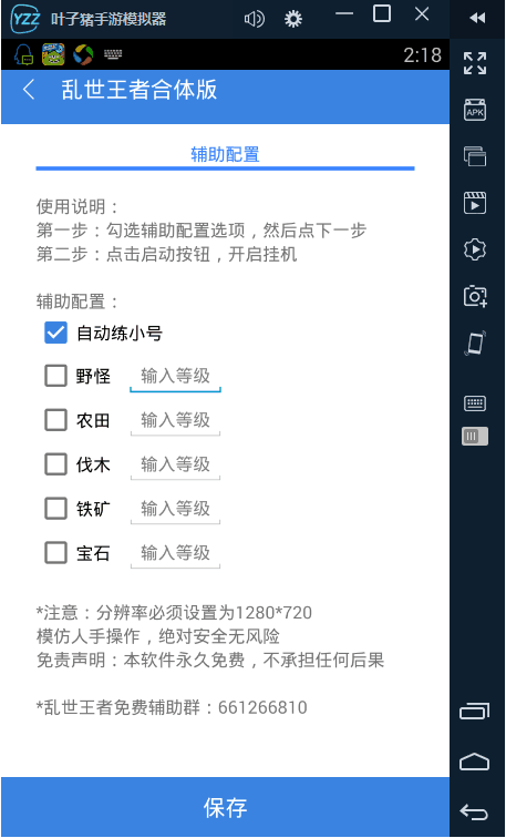 在乱世王者中真正的霸主要么是多号党,要么就是无限收资源号。因为这个游戏想要快速崛起,单靠自己一个号是不行的。乱世王者小号能为大号提供大号不曾涉及的资源领域。 小号作用:种田收集资源,用免费的迁城令迁移到大号旁边,让大号劫掠获取资源。 小编推荐一款叶子猪模拟器,模拟器自带练小号功能(7级),还有自动采集资源辅助。 【使用教程】 1,辅助器加载:在叶子猪模拟器开启游戏后,在上方的功能栏上选择“免费挂机”,耐心等待加载完毕。 2,在辅助器界面勾选想用的功能,点击下一步。 自动练野猪号功能还是挺实用的,点个赞! 叶子猪模拟器官方交流群:272609065 叶子猪模拟器下载地址:http://downtool.yzz.cn/php/dl.php?id=lswz 了解更多相关信息,请前往http://sy.yzz.cn/lswz/ |