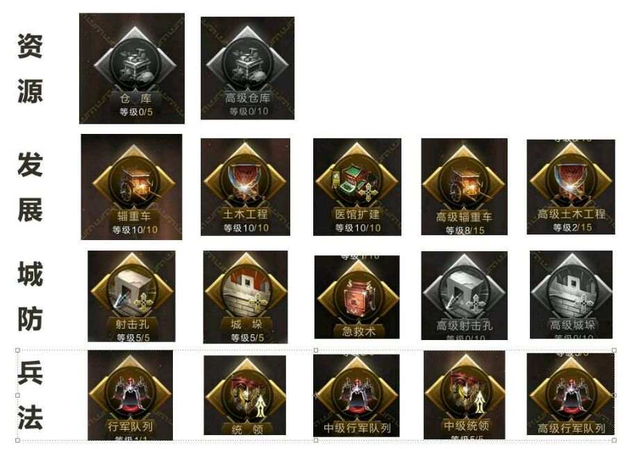 游戏开服那么久看看圈子里面也没有什么权威的攻略和玩法说明,游戏里面么有钱的没钱大把不知道该怎么发展和建造的,有点看不下去了;这里就写一个建设和发展的攻略,攻略分为公共篇,以及穷人篇和富人篇,自行选择观看。 玩家交易群:661266810 -------------------公共篇------------------- 一. 城外建筑 急救:8 没什么好说的。 征兵:8 没什么好说的。 木材:10 中前期木头很缺多拿点是点。 良田:1 城内粮食基本上跟不上消耗,所以不占用城内地块,仅留一块田做做任务。 铁矿:6 个人喜好 宝石:2 个人喜好 总结:总体来说确保8征兵,8急救,1块田就好了 其他可以按照自己喜好搭配;如果这三个和你目前的不同那么久可以快点处理了,因为越到后面,损失越大。 二.城内建筑没什么特别好说的,都要造;但是升级以后讲究,穷人富人不同,后面会说但是有几个东西没有特殊需求尽量别升级: 1. 箭塔 2. 市场 3. 陷阱工厂 4. 祭坛 三.造兵其他兵种根据具体情况造车:早期造大约50000 1级车,之后随意陷阱:完全不要去造,浪费资源 四. 资源管理 发展前期缺木发展中前期缺铁发展中后期缺宝石发展前期中期后期都缺粮食所以尽量把保护资源的粮食留下来,以备不时之需,尽量用非保护的粮食。 五.加速使用加速道具的使用是有讲究的,其他建筑升级尽量不要使用加速,但是下面几个东西升级尽量要用加速道具,因为这几个建筑的生产不能停。 1. 步兵营 2. 骑兵营 3. 弓兵营 4. 太史殿 ----------------------穷人篇---------------------- 作为一个穷人,你很少充值,几乎不充钱。你们要的是保护自己的资源,保护自己的兵,然后夹缝中升级在看到上面通用的玩法情况下,你还需要知道这些重点: 一. 城外建筑 征兵:不着急升级,造8个但是主升一个,因为造一个为了升级急救站 急救站:优先升级,因为被打了之后可以接受更多的伤兵其他看情况 二. 城内建筑 1. 战争大厅:绝对不要升级,没什么用。 2. 仓库一定要升高,可以保护资源 3. 烽火台:建议升级到14级,能够看到是否有援兵 4. 四兵营:逐步升级,分别都到22之后,接下来就只须要按照升城堡的条件来升级了。 5. 校场:根据家里兵的总数来升级,最好的算法是总兵数=4*单只部队数量+急救站容纳数量(假设充值不够少一兵线)其他的循序渐进 三. 造兵兵对你来说兵没有太大作用,只要够采集就好了,主要最好的塞兵地点是盟矿。 四.科技学习下图是你要尽快学会的科技? 五.资源管理 1. 所有资源最好卡时间点消耗。 2. 灵活使用盟内的仓库,每天都存一点,建议存粮食,因为会被兵吃掉。 六.藏兵藏兵是指你不开罩子,家里没资源的情况下把有生力量派出去,这里推荐几个方法: 1. 最好的办法是把盟矿拆掉,然后把所有的采集部队一口气能送多少送多少去造矿,矿造好之后就可以一直挖矿了,并且只消耗一支部队。 2. 帝陵,这里要说的是尽量把兵派去很远的地方的帝陵,特别是能够跨越黑土地的。 3. 支援盟友,这里要说一下两个重点: a) 单支支援部队应该要小于急救站数量,否则回来就会死。 b) 如果支援多个盟友,并且都被打了,记着单支部队回来,治疗好了再回来另外一支,否则容易爆急救。 玩家交易群:661266810 叶子猪模拟器官方交流群:272609065 叶子猪模拟器下载地址:http://downtool.yzz.cn/yzzbox/v4x/yzz_android_installer_4.0.11.exe 了解更多相关信息,请前往http://sy.yzz.cn/lswz/ |