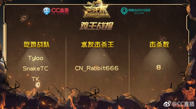 CC直播《鸡王杯》第三场天气晴天,航线右上到左下;CC直播电子竞技俱乐部拿到第一个空投M24大狙;另一方面从机场杀出来的iG电子竞技俱乐部?全队碰到强力水友阻击,但是通过iG_XBG精准的98K,只被打掉小绝一人,就突破包围圈,令人瞠目结舌的是LF电子竞技俱乐部?四人翻车团灭死于毒圈外;决赛圈刷到遗迹附近,由TK3人组,iG_XBG合GK_0003组成,最后XBG 1V3 打掉一人后被击杀,恭喜TK最后吃鸡,拿下12个人头,枪刚的iG_XBG最后拿下9个人头,而水友击杀王由CN_Rabbit666拿下。
