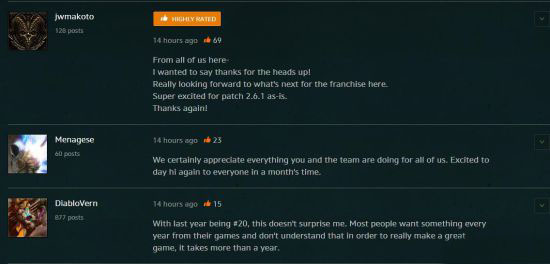 距离一年一度的暴雪嘉年华盛会开幕还有一个多月的时间,在去年的暴雪嘉年华活动中,官方公布了《暗黑破坏神3》“死灵再世”资料片以及相关20周年纪念活动,不少《暗黑3》的粉丝可能也期待着今年暴雪嘉年华会为我们带来些什么样的惊喜。不过近日官方就通过蓝贴公告表示:今年的嘉年华上不会公布《暗黑破坏神》的新消息了。 今天早些时候《暗黑3》社区经理Nevalistis在官方论坛发布蓝贴,以下为蓝贴原文: “暴雪嘉年华日渐临近,我们想要告知大家一些嘉年华上《暗黑破坏神》展出内容的最新消息。在去年的嘉年华开幕式上,我们开启了《暗黑破坏神》20周年庆典,公布了“死灵再世”资料片以及《暗黑1》纪念地下城(如果你错过了这个活动也没关系,因为它会在1月份回归)。我们想要先告知大家:尽管《暗黑破坏神》还将在今年的嘉年华上出现,但是我们不会公布任何《暗黑破坏神》的新消息。在未来的某个时间点上会有(新消息)但是现在时机未到。” 在蓝帖内容中官方也提到会向购买了虚拟门票的玩家提供《暗黑破坏神》的直播以及特殊的《暗黑3》游戏奖励,同时他也预告2.6.1版本不久之后就将上线,除此之外,开发团队也在为《暗黑破坏神》的未来辛勤工作,探究这个系列的下一步走向,请大家耐心等待。 尽管官方明确表示今年没有新内容,不过玩家们倒也没有太过沮丧,下方回帖的玩家对本帖的回复相当积极,他们感谢了官方团队的工作,同时也表示了对2.6.1版本的期待。也让我们共同耐心等待《暗黑破坏神》开发团队在未来为我们带来新的惊喜。 跟帖的玩家们依然表示了对制作组的支持 了解更多相关信息,请前往http://d3.yzz.cn/ |