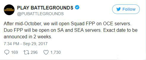 《绝地求生:大逃杀》将开启小队第一人称模式 十月中旬之后