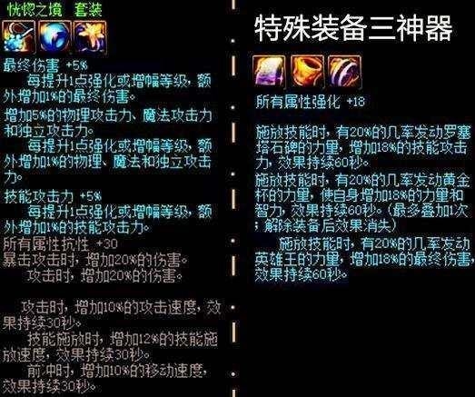 特殊装备三神器左槽可以只增加18%力量和智力,右槽是增加18%技能攻击力,耳环是增加18%最终伤害,每个部位都有18点所有属强提升,互不冲突。恍惚套三神器,恍惚三件套拥有完美的、互不冲突的17%技能攻击力、17%最终伤害、20%黄字和20%暴伤提升。恍惚三神器和特殊装备三神器这6件装备的搭配也是毫无冲突,90版本的版本神器是毫无疑问的。 手镯和项链部位冲突,套装属性附加20%伤害,虽然还会进入麻烦的混乱状态。但85版本的版本神器是精炼的异界魔石首饰套,绝对不是冰雪套。首先项链部位20%伤害,戒指是目前都无法替代的重置技能CD神器,手镯部位我们忽略不算。 80版本中没有什么强力的套装,而金魂骨系列搭配是当时最流行的。这里说一下风华套不是80版本的。为什么金魂骨是版本神器呢?因为DNF5周年庆出了金手镯,而80版本的更新刚好是在2013年,金手镯作为手镯部位奇迹般的出现了9%伤害提升,而魂链不用说都是极强的强散,所以80版本流行金手镯+魂链,剩下的戒指部位根据自己的需要选择。 70版本诞生的史诗首饰套,但等级却是60级的套装。单件战神首饰的属性很辣鸡,但是套装属性最高附加23%伤害,还有10%三速、力量和智力,当时拥有这套首饰套的PK技术都不会差到哪里去。 悲鸣副本的难度极大,加上门票成本高,任务周期长,在60版本能做出悲鸣套的玩家很少。在什么都缺的版本,手镯能弥补玩家的双暴,项链可以提升8%的伤害,而戒指则是2%的三速,不要小看2%,要知道墨竹也才3%移速就可以贵上天了。 了解更多相关信息,请前往http://dnf.yzz.cn/ |