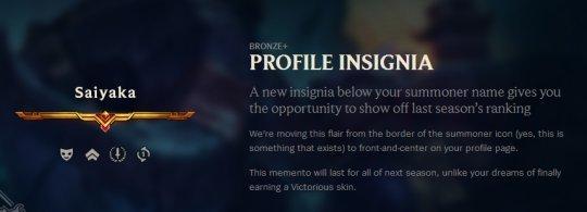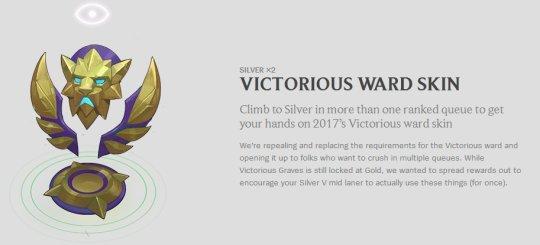 这个赛季的胜利者皮肤将属于法外狂徒 格雷福斯。伴随这款胜利皮肤的同时将会有3款炫彩皮肤以及1个对应的胜利者守卫眼石皮肤。 这个赛季的胜利者皮肤将属于法外狂徒 格雷福斯。 伴随这款胜利皮肤的同时将会有3款炫彩皮肤以及1个对应的胜利者守卫眼石皮肤。 排位奖励 青铜 - 个人主页标志徽章 - 召唤师头像 白银 - 个人主页标志徽章 - 召唤师头像 - 载入界面边框 - 胜利守卫皮肤(2种排位成绩以上) 黄金以上 - 个人主页标志徽章 - 召唤师头像 - 载入界面边框 - 胜利守卫皮肤(2种排位成绩以上) - 胜利男枪皮肤(每种排位的成绩附赠一个炫彩:单双/灵活/扭曲,一共可得3个炫彩) 黄金以上 胜利男枪+炫彩 在赛季结束时达成黄金及以上段位的你,将获得“胜利爷们儿-格里福斯",并根据你的各个排位成绩(单双/灵活/扭曲)附赠相同数量的皮肤炫彩。 青铜以上 (照常介绍了这个赛季的个人主页标志徽章、召唤师头像、载入界面边框)。。。以及一组新的召唤师头像,你可以根据排位成绩获得最多3个头像(单双/灵活/扭曲) 记住:不管别人怎么说,你依然是了不起的挑战者(排位),即使是在扭曲丛林。 胜利守卫皮肤 在2017赛季在至少两种排位游戏爬上白银的你将会获得“2017胜利守卫皮肤”。 我们重置了胜利守卫皮肤的获得条件,把它向那些想要在多个排位中虐菜的家伙们解锁。就像黄金以上能获得胜利男枪一样,我们同样希望通过扩散这类奖励,来鼓励白银V的中单来积极使用它。 荣誉奖励 我们决定以一种全新的、让人激动的方式来褒奖游戏中那些愉快的合作、优秀的指挥和友好的交流:所有荣誉玩家都将会知道他们自己是个好人,因为”为荣誉而战本身就是一种奖励。” 当然这是开玩笑的(并不好笑委屈),这才是真正的奖励: 荣誉守卫皮肤 达到了荣誉3级以上,你将在赛季结束时根据你的荣誉等级获得一款独特的守卫皮肤。 这款眼皮经历了意义重大的测试与研究,我们的大数据显示:这让游戏中减少了389%的不正当行为。 |