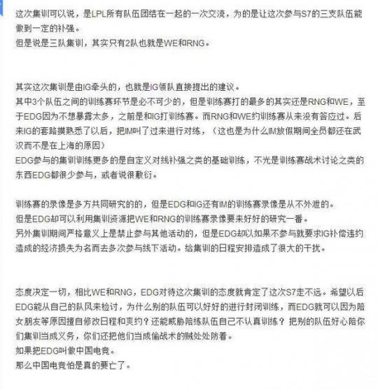 导读台湾网友热议EDG泄密门:突然觉得台湾人很善良 这两天关于EDG的节奏不断,更可怕的是闹到台湾PPT论坛以及国外论坛Reddit去了,目前台湾PTT论坛有多个帖子在讨论EDG。 其中一个帖子截图 以下为搬运原文 EDG这个礼拜跟闪电狼一样以0-3作收,但是因为EDG的特殊性,这几天EDG过的比闪电狼惨多,每个队员妈妈不知道死多少次,EDG粉丝团贴文一出,30秒内涌入数万则推文在喷,这两天EDG又爆出了泄密门事件跟mouse生日说谎事件,让EDG的处境更加艰难 懒人包大概是这样(从对岸论坛抄过来的) 1、edg敷衍训练赛 众所周知为了这次全球总决赛lpl耗费了大量的人力和资源来为三支队伍做训练只求取得更好的成绩。但是训练赛的时候edg并没有来原因是因为签订了合同,俱乐部个人活动去了葫芦岛,这个edg的官博上有,事后又是约了韩国队伍训练从而放鸽子了lpl,这样这次集训真正训练的只有rng和we,而edg只是最后打卡漏了波脸。 2、edg两面三刀 虽然这次训练赛edg并没有来,但是由于其他两队的集训视讯都是在队内公开所以edg可以轻易的拿到录像,而edg在拿到录像后,回去找了im来模仿两队的bp做出针对,这些并未公开给其他队伍,大致原因是因为edg并没有太过于担心小组出线名额,怕的是8强碰到lpl的队伍可以阴一手 3、edg的泄密事件 在赛事进行到第三天的时候,edg并未取得好的成绩,将要面对巨大的舆论以及攻击,而we和rng则取得了开门红,edg为了解决这一情况与其他队伍训练的时候暴露了其他队伍的战术,总决赛第三天we对战tsm整场比赛受到压制,bp更是被完全针对,不出意外tsm赢得了这场比赛,除了tsm本身的硬实力外,we无论从bp上还是整体游戏节奏都被针对的很明显。赛后tsm的上单在接受采访时说到“能拿下这场比赛很开心,bp的灵感来源于上一天的训练赛”而上一次与他们训练的正是edg。总决赛第四天,rng对战g2,前期挖掘机在刷完第一个野怪时直接去了石头人,这让当时的三维解说都大感疑惑,摸不到头脑,因为在野区挖掘机并不惧怕猪妹,而事后香锅果然来反野,被对方眼位侦察到浪费了大量时间,比赛前20分钟g2牢牢把握住节奏,无论是小龙还是一血塔都顺利拿下,rng完全被牵着鼻子走。最后在出色的团战和老鼠亮眼的发挥下艰难拿下比赛,g2真的那么强吗?也许很强,但是前一天rng打三星都是成碾压,对战g2还受到压制,我们不免有些怀疑 有人拿这边文章去问LOL解说 致幻 除此之外,EDG又出现了mouse生日说谎事件 起因是这样的,EDG在三连败之后还所有人跑去电影院看电影,结果被粉丝拍到照片 后来,EDG官方发文洗白解释说是因为mouse生日,在心理师建议下带他们放松顺便帮他庆生 但是生日这件事被人挖出是在说谎,因为去年时,明明是9月帮mouse庆生,就算是农历也 对不上 这几天EDG 3连败又发生泄密门、训练赛不配合,跑去看电影事件,在对岸各个论坛被喷的很惨 以下为台湾网友评论 评论:讨论泄密事件 cxcxc123 : 团练泄密 黑人问号 torrot : 原来之前那篇日记文说的无间道是指异地鸡啊! pi020412 : Tabe:其实我这样也还好 PeterHenson : tabe解套了 gaym19 : TABE算甚么 EDG这才叫高招 Halu5566 : 如果是真的 也太脏了 自己0-3还要拖别人下水 gaym19 : 因为拉别人下水的话可以找借口开脱 tauobaek : 果然0-3都是自己找的 怪不了别人 k1222 : EDG太子队不意外 GAOTT : ahq要小心fw想拖人下水 btgg : 兵不厌诈 这是战争!! btgg : 国内王黑暗兵法 勿嘴~ lnsattaida : 好恶心的态度 我烂你也别想好 直接资敌 zxc60804 : 没事儿没事儿 让腾讯爸爸来个时光裂隙 修正一下就好 class21535 : EDG真的永远不缺话题 别人都没事就他毛最多 sm999222 : 除非真的有证据..那些都不太像是证据只是单方面说词 Ofnir : 凭甚么we一定得赢tsm? turtleaoc : G2本来就不弱 难道MSI赢WE也EDG害的? luvstarrysky: 不过WE好像一被看穿套路通常就是输 RNG就比较好一点 jackysuyu : edg以往做过太多小动作了edg是真的有可能做的出这种事的战队 taeyeon09 : 好粗糙的黑人法 墙倒众人推 打得烂是烂 理由太扯 engelba : 突然觉得台湾人很善良 GAOTT : 台湾人真der hen善良 各种鼓励电狼 评论:讨论致幻 tim8177414 : 致幻 也太好钓 XD Chiayi0728 : 致幻估计凉了 我们怀念他 piyo0604 : 致幻也是真的...... 这种事情无视就好回什么啊 supreme32 : 致幻......他是有别的打算吧 这种事也能钓 Ofnir : 其实问致幻确认的只有edg有自跟im隐藏的训练赛而已 评论:讨论看电影 haya315 : 就第一周打完看个电影不可以喔 sm999222 : 也有可能碰到世界赛 提前庆祝啊. capssan : 人家生日多一点不行吗 一堆暴民 sm999222 : 但是生日那个也说不准耶.. tauobaek : 而且如果生日是阳历阴历这样算下来S5春季赛他才16 loki5566 : 国人连生日都能是假的 Satoman : 搞不好出生日期和报户口日期不一样R kaki1231 : 搞不好钱都收到了当然去放松 aa123123 : 看电影还行 转换转换情绪 泄密给TSM就真的下去吧 Chantaljones: 泄密那个有点扯 生日则是活该 dead11 : EDG打输还敢看电影= = dead11 : 那位国人兄弟可以帮忙看一下FW去哪里喝酒吗 评论:其它 Santana9 : EDG之前用一堆特权,现在非EDG迷当然找机会黑死他们 slayer6603 : EDG输的时候 场下一堆欢呼 真的惨 luvstarrysky: EDG输的时候台下欢呼??? 这也太夸张了吧 adlazyyy : EDG输的时候一堆欢呼???你没看到小姊姊举牌吗 sugata : 看他们战队做过哪些事 被黑不是没有原因的 jackysuyu : edg做过太多太多恶心的事 这事情发生在其他