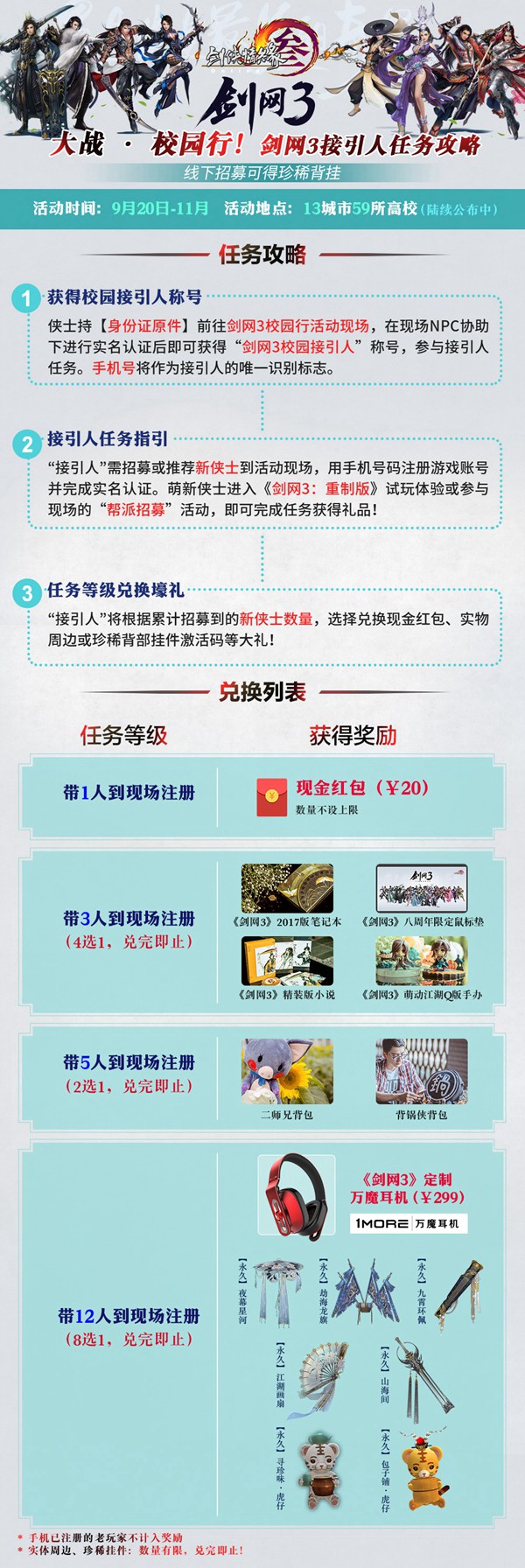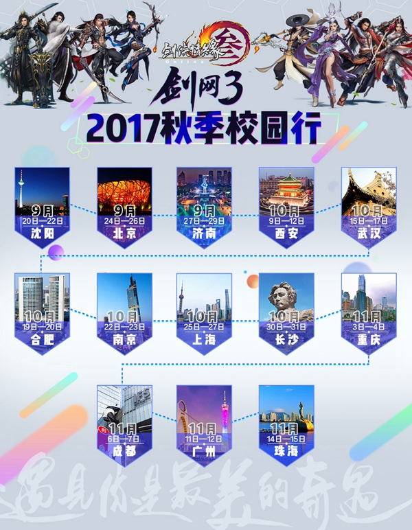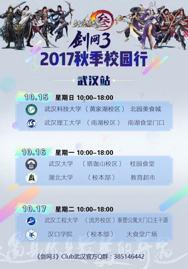 感受到江城学子们的热情召唤,校园行“武汉站”神行点将于10月15日(本周日)开启!不知这次《剑网3》校园行将会与荆楚大地擦出怎样奇妙火花呢?快来本次校园行看看有哪些高校吧! 随着校园行走遍大江南北,剑网3接引人任务也在火爆进行中!只要拉好友前来活动现场注册,就有机会获得永久珍稀挂件激活码、现金红包、实物周边等“壕”华大礼!同时还有机会随机掉落“广宴奇遇”!《剑网3》买单请你来吃饭!大家准备好了吗?我们要拉大旗咯! 《剑网3》本次秋季校园行已经走过沈阳、北京、济南与西安四站,在刚刚结束的西安站中,广大西安高校的学子们也让我们感受到了来自古都长安的热情!北方一夜入冬,寒风萧瑟中还有有爱玩家专门前来投食,暖胃更暖心~ 西安校园行场照 而在“西安培华学院”神行点中,我们也偶遇了大学生创业街区!通过现场采访,一起来看看创业街区的学子们在《剑网3》里怎样实现赚钱的? 感谢剑网3校园行活动合作伙伴万魔耳机的支持!本周日,《剑网3》校园行将空降江城,武汉的同学们都准备好了么?整装出发,跟着《剑网3》校园行一起出发游江湖吧! |