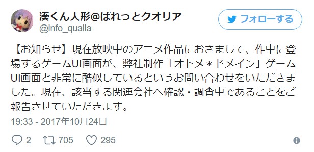 在日本动画中吐槽这一元素还是非常常见的,像《银魂》就是以各种吐槽而著称。不过这些吐槽别的作品的行为会为了避免版权方面的麻烦,一般都是经过处理的。正在播出的《干物妹小埋》第二季动画中也加大了对其它作品的吐槽,比如之前的《柯南》的情节。然而不是所有的对象都能泰然处之,在《干物妹小埋》最新一集中就出现了游戏的界面,而这个界面被指出和游戏《少女领域》的界面高度相似。对此《少女领域》的制作公司宣布正在调查小埋第二季动画第3集中盗用《少女领域》游戏UI相关问题。 这次在小埋第二季动画第3话当中,出现了一个剧中的游戏,而这个剧中剧游戏的UI被一些网友认为与伪娘题材游戏《少女领域》的UI高度相似,并且去询问官方。于是《少女领域》的游戏制作官方在twitter上说明,现在正在播出的动画的剧中剧游戏,与《少女领域》游戏UI画面非常酷似,目前正在向相关公司确认调查中。 如果《干物妹小埋》2期动画中使用的游戏界面确实是《少女领域》的UI,感觉动画公司至少得出来谢罪。不过从目前公开的图来看,确实非常的相似,感觉制作组这次真是有点玩大了。