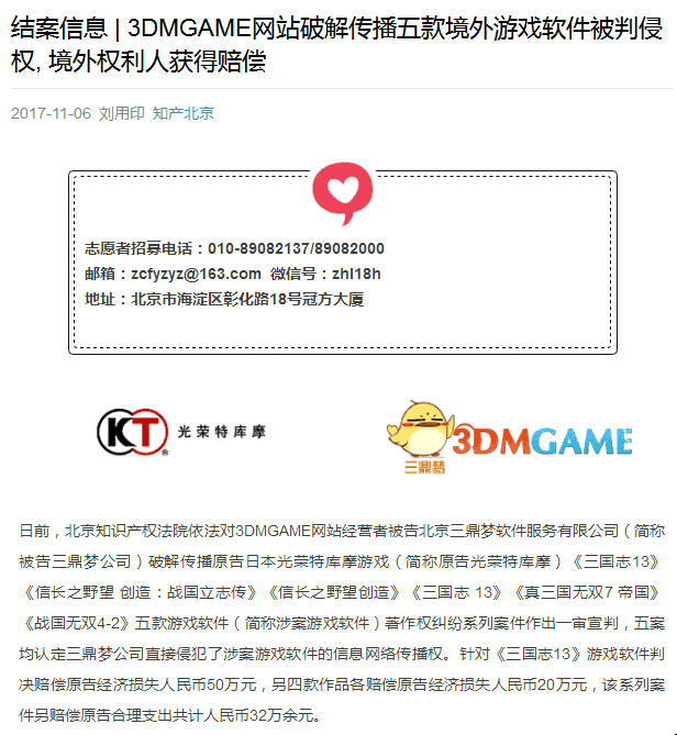如果你问国内游戏玩家最熟悉的单机游戏网站,可能答案之一必然会有3DMGAME。 3DMGAME是中国著名的单机游戏综合性论坛,是以讨论分享各种游戏破解程序为主、汉化游戏为特色的网站。其创始人为“鸟姐”宿菲菲。不过,随着近年来版权保护意识的逐渐加强,关于3DM破解游戏的非议越来越多。毕竟众口难调,众多游戏玩家感激于3DM带来的免费福利,而支持正版者则愤怒地斥其盗窃。因此,“鸟姐”早在去年2月宣布:“今后3DM不会再破解任何单机游戏了。” 然而,日前,北京知识产权法院官方公众号发布公告,认定3DMGAME侵权传播日本光荣公司5款单机游戏,最后3DM一审被判赔偿光荣合计162万元人民币。 原告光荣诉称,被告三鼎梦公司(3DM经营者)未经许可将其享有著作权的五款涉案游戏软件破解后上传至其网站,故请求法院判令三鼎梦公司停止侵权、赔礼道歉并赔偿损失。 被告三鼎梦公司则辩称,涉案游戏软件无法在中华人民共和国境内正常取得,其未上传涉案游戏软件,没有实施侵权行为,且原告主张的经济损失的计算方式没有依据。 法院认为,由于光荣公司并未提供在国内实际销售的证据,也未提交充分证据证明被侵权所受到的实际损失或侵权获利情况,所以并不支持光荣提出的200万元赔偿要求。但法院同时认为,考虑到《三国志13》盗版在3DM上下载超过200万次,说明游戏极具经济价值;另一方面,从3DM多次收到律师函警告以及站长宿菲菲微博言论来看,3DM的侵权行为具有较长时间的连续性,主观恶意明显。最终,法院针对《三国志13》判决赔偿原告人民币50万元,另四款作品各赔偿原告人民币20万元,该系列案件另赔偿原告合理支出共计人民币32万余元,总共162万元。 事实上,从2012年起,光荣就开始向3DM发送警告函要求下架盗版,直到2016年5月才最终向3DM发起诉讼。值得一提的是,此判例开了海外游戏公司状告国内盗版内容发布网站胜诉的先河。 客观来说,盗版的确不可取,玩盗版也不应该值得自豪。但迫于国内的市场环境,作为游戏爱好者,我们曾经都不可避免地玩过盗版游戏。笔者认为,随着版权保护意识的提高与相关法规制度的完善,正版游戏在国内的生存之道必然愈发畅顺。 |