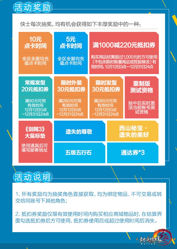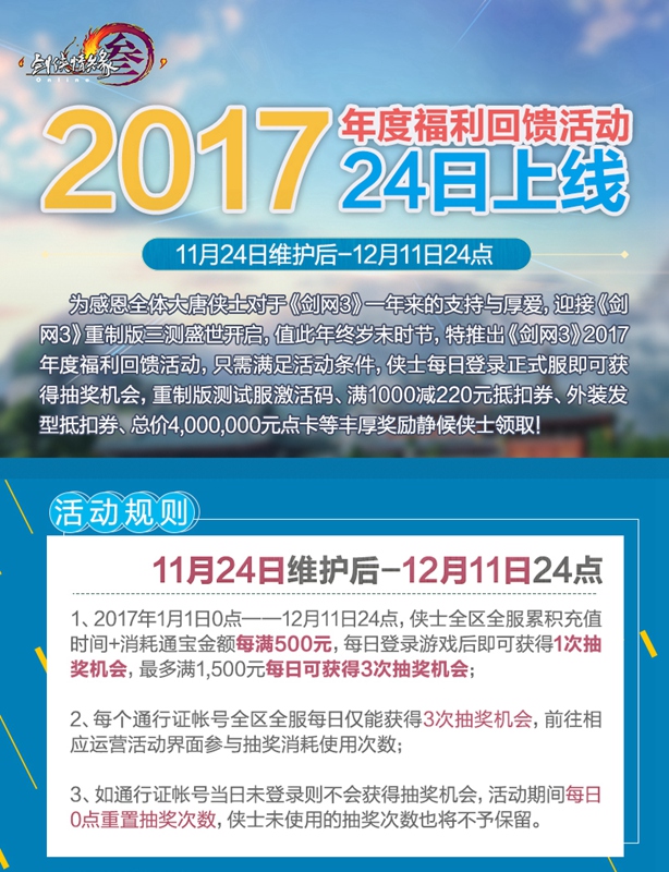 《剑网3》重制版三测24日开启,海量内容上线,制作人郭炜炜携策划团队当晚20:00开启全网直播。全门派武学改造再度优化,“狼牙堡·战兽山”25人模式诚邀挑战!更有2017年年度充消福利回馈活动11月24日上线正式服,每日签到即有机会获得重制版测试服激活码、满1000减220元抵扣券、外装发型抵扣券、总价4,000,000元点卡等丰厚奖励。 本批三测资格发放时间:11月23日11:00 本批三测资格发放数量:30,000个 【2017年度福利回馈活动24日上线】 为感恩全体大唐侠士对于《剑网3》一年来的支持与厚爱,迎接《剑网3》重制版三测盛世开启,值此年终岁末时节,特推出《剑网3》2017年度福利回馈活动,只需满足活动条件,侠士每日登录正式服即可获得抽奖机会,重制版测试服激活码、满1000减220元抵扣券、外装发型抵扣券、总价4,000,000元点卡等丰厚奖励静候侠士领取! 活动时间:11月24日维护后-12月11日24点 活动规则: 1、侠士全区全服2017年1月1日0点——12月11日24点期间累积充值时间+消耗通宝金额每满500元,每日登录游戏后即可获得1次抽奖机会,最多满1,500元每日可获得3次抽奖机会; 2、每个通行证帐号全区全服每日仅能获得3次抽奖机会,前往相应运营活动界面参与抽奖消耗使用次数; 3、如通行证帐号当日未登录则不会获得抽奖机会,活动期间每日0点重置抽奖次数,侠士未使用的抽奖次数也将不予保留,请广大侠士记得每日登录抽取奖励哦! 活动奖励: 侠士每次抽奖,均有机会获得如下丰厚奖励中的一种: 1、重制版测试资格(抽中之后实时激活当前帐号测试资格); 2、10元点卡时间(全区全服均充值点卡时间); 3、5元点卡时间(全区全服均充值点卡时间); 4、满1000减220元抵扣券,仅限侠士购买商品结算超过1,000元时方可使用,结算界面内商品不可包含限时限量商品或捏脸修改。有效使用时间:12月12日0点—12月31日24点; 5、常规发型20元抵扣券,满90元可用,有效使用时间:12月12日0点—12月31日24点; 6、限时外装30元抵扣券,满280元可用,有效使用时间:12月12日0点—12月31日24点; 7、限时发型30元抵扣券,满280元可用,有效使用时间:12月12日0点—12月31日24点; 8、西山秘宝·遗失的美好; 9、《剑网3》大鼠标垫(使用道具后可填写邮寄地址) 10、遗失的尊敬; 11、五级五行石; 12、通达券*3 TIPS: 1、所有奖励均为抽奖角色直接获取,均为绑定物品,不可交易或转交给同账号下其他角色; 2、抵扣券奖励仅限有效使用时间内购买相应商城物品时,在结算界面勾选抵扣券后方可使用,抵扣券使用后或超过使用时间后消失。 《剑网3》重制版三测24日盛世开测,侠士每日首次登录测试服签到不仅可获得15,000测试服通宝,还可获得数量不等的测试服积分奖励,还有全新三测纪念特效称号“侠万里”等待广大热爱探索的侠士领取哦!与二测纪念特效称号“纵江湖”合并展示,更有独特表现效果! 了解更多相关信息,请前往http://jx3.yzz.cn/ |