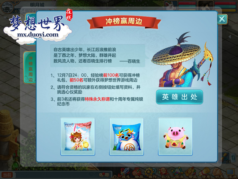 为热烈庆祝《梦想世界》陪伴玩家度过十年游戏时光,梦想十周年主题新服“一梦十年”今日盛大开启,参加新服冲级活动可以赢得礼包、神兽、十周年纪念币等豪礼!梦想十周年庆典火热进行当中,五大经典活动暖心回归,带你重回少年时代;“梦想时光机”故事征集中,纪念周边、现金大奖等你来拿! 十周年主题新服今日开启 冲级送豪礼 喜迎《梦想世界》十周年,主题新服“一梦十年”今日火爆开启,一同开启的还有主题新服特别冲级活动。在12月7日之前等级达到50级并且在线时间满60小时的玩家,即可获得冲级礼包。系统还将在所有满足上述条件的玩家中抽取3名幸运儿赠送随机神兽! 热情冲级的玩家还有机会获得更多丰厚奖励,在12月7日之前,经验榜前100名玩家可以获得冲榜礼包,而前50名玩家还可以额外获得游戏周边!奋战到经验榜前3名的玩家能够获得特殊永久称谓以及十周年专属纯银纪念币!极具观赏、纪念、收藏意义的梦想十周年定制纪念币正等着勤奋的玩家领取回家,赶快进入新服提升等级吧! 重温过去 五大经典活动重磅回归 在《梦想世界》陪伴玩家十年的时光中,许多玩法在游戏版本更新迭代中无奈地被更优质的玩法替代,但时至今日回想起来,其中又有许多让人怀念的有趣玩法。此次梦想十周年庆典将带玩家重温过去,在11月17日至12月17日活动期间,五大经典活动重磅开启! 航海探险 海商传奇再度起航 活动期间每周五19:00-20:00,等级大于30级的玩家可以组成三人队伍,到明月城(343,226)艾梦想处,报名参加“海商传奇”活动。领取了初始资金和船只的玩家,就可以前往海岛进行经商和探险。在不同岛屿之间买卖商品、赚取差价,赚得足够利润就可以顺利完成任务!在探险的过程中,还可能触发各种随机事件,玩家也可以使用道具卡来帮助自己或者干预对手,适当使用道具卡会事半功倍哦! 兔狼争端再起 决战神石殿 活动期间每周四15:00-17:00,等级达到30级的玩家可以借此盛典重温兔狼之战,组成两人队伍或者单人前往明月城(346,226)梦时光处,报名参加神石殿之战,为阵营而战!进入活动后,玩家将被随机分配到兔或狼不同阵营,玩家可以选择主动出击敌营或者留守己方阵营进行防守。玩家出征时会召唤己方NPC前往敌营,通过点击对方NPC可以与召唤该NPC的队伍进行对决,成功击败对方图腾次数高的阵营则获胜! 智斗魔尊 天魔之战再现 活动期间每周二10:00-23:00,趁着魔营大乱,等级达到30级的玩家可以组成4人以上队伍,到明月城梦时光(343,226)处报名参加“天魔之战”。根据任务提醒来完成指定的战斗,智取魔尊,共同维护梦想大陆和平! 解救小羊 寻羊历险记梦幻回归 活动期间每周三12:00-13:00和18:00-19:00,四国首都、太息林地、天水平原和落日海湾遍地梦幻的彩色泡泡,拯救小羊的时候到了!等级达到30级的玩家可以前往明月城梦时光(343,226)处参加“寻羊历险记”活动,接取任务并前往上述地点,戳破泡泡解救被困住的小羊羔,别忘了还要安全护送它们回家哦! 瑞兽赐宝 招财进宝福从天降 活动期间每周一10:00-23:00,神秘的聚宝兽将降临到梦想大陆上,等级达到30级的玩家可以在明月城(343,226)艾梦想处兑换元宝后,前往天水平原和太息林地寻找聚宝兽。找到聚宝兽之后,玩家需要把握时机向聚宝兽进贡元宝,说服聚宝兽后就可以获得奖励了! 畅想往事 梦想故事征集送好礼 十年风雨兼程,不管我们开心还是失意,《梦想世界》一直默默地在这里等待着我们的到来,拥抱每一位玩家。十年中可以发生很多事,让人感动让人笑,其中少不了许多难忘的事情,你又记得多少呢?11月16日至12月30日活动期间,只需在官网活动页面记录下你的梦想旅程中最难以磨灭的回忆,并填写“服务器+游戏昵称+有效联系方式”,即可参加活动。《梦想世界》准备了游戏周边、京东卡、十周年纪念币、十周年纪念T恤等奖品送给认真参与活动的玩家,获得奖励的玩家还可以获得优先参与地面活动的特权! 十年如一日,《梦想世界》还会一直陪伴大家走下去。梦想十周年庆典真诚回馈,参与活动即可赢取各种周边奖品。主题新服“一梦十年”冲级更有机会获得十周年纯银纪念币,进入梦想大陆开启你的梦想征程吧! 关于《梦想世界》 《梦想世界》是多益网络推出的高端回合战斗网游,拥有富有策略的战斗系统,11个流派421种招式,相生相克变幻无穷。独创电影式副本,带你穿梭古代未来,结交关羽,飞上太空战机械之王,探索超乎想象力的奇幻世界。随心打造个性角色,华丽翅膀、拉风坐骑、多彩光环、超萌小精灵等自由搭配。实时语音畅聊,结交游戏好友,遇上唯美爱情,一起闯荡武侠江湖。 了解更多相关信息,请前往http://mx.yzz.cn/ |