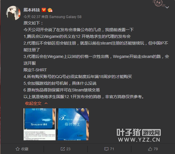 自腾讯宣布代理《绝地求生:大逃杀》,不少玩家纷纷表示期待“吃鸡”国服的到来。 今天,微博用户“熊本科技”发布了关于《绝地求生》国服的最新爆料,一睹为快。 原文如下: 今天公司开会说了在发布会准备公布的几点,我提前透露一下: 1.腾讯会以Wegame的名义在12开绝地求生的代理的发布会 2.代理后不会锁区但会锁注册,就是以前在steam注册的还能继续玩,但中国IP不能注册了 3.代理后会在Wegame上以98的价格一次性出售,Wegame开始走steam的路,会送开服限定T-SHIRT 4.所有购买账号的QQ号必须实制度后年满18周岁的才能购买 5.会加强游戏的封号机制,具体什么没说 6.原有饰品得到保留并可在Steam继续交易 以上就是绝地求生国服12.1开发布会的消息,非官方消息仅供参考。 同时,博主还自称腾讯“临时员工”,似乎具有一定的可信度。 然而,经DoNews记者询问,腾讯官方表示此传闻为假消息,腾讯将在之后陆续公布关于代理国服《绝地求生》的详细信息。 事实上,在此之前腾讯曾在《PUBG》国服代理的公告中表示,游戏的正式中文译名还未公布和确定,产品的运营和本地化工作将由一个独立部门直接负责。也就是说,拿下“吃鸡”代理权的是腾讯游戏部门而不是Wegame团队,这与传闻中“以Wegame名义”的说法不符。 虽然国服“吃鸡”一事尚未尘埃落定,但根据腾讯的说法,作为一个具有社会责任感的企业,腾讯将坚持为用户们传递具有教育指导意义的游戏内容,尤其是为未成年人用户传递健康正向的文化理念和价值观导向。所以,如果你将来在“吃鸡”时看到这样的场景,千万不要太惊讶哦。 据悉,腾讯关于《绝地求生》国服的发布会将在12月1日在成都举办的腾讯游戏嘉年华上进行,届时相信大部分玩家的疑问都会迎刃而解。 了解更多相关信息,请前往http://game.yzz.cn/html/info-5304.html |