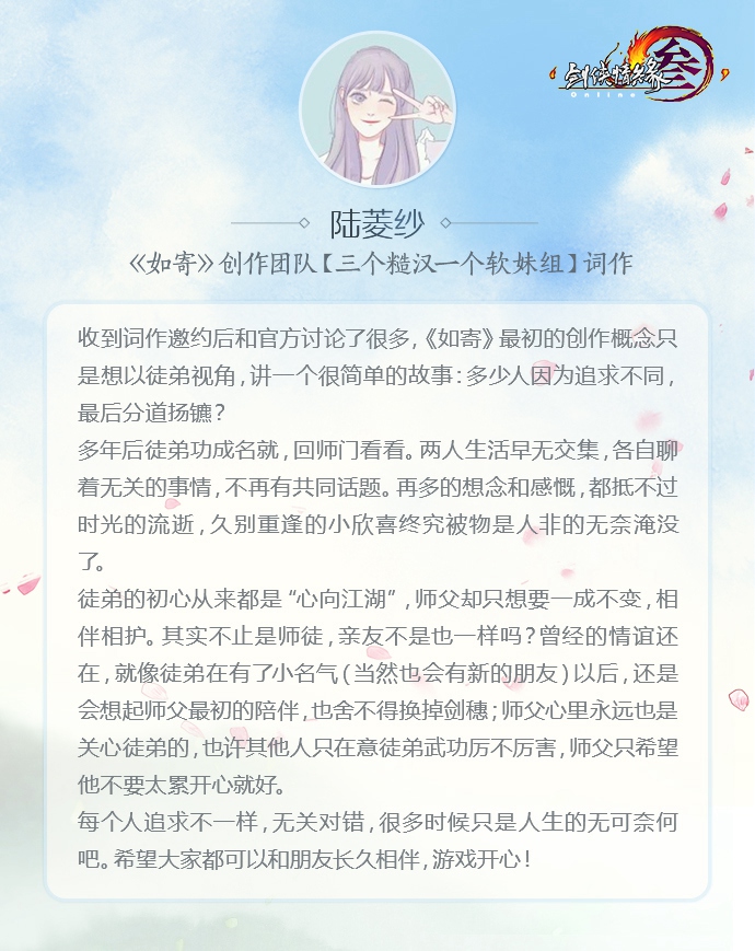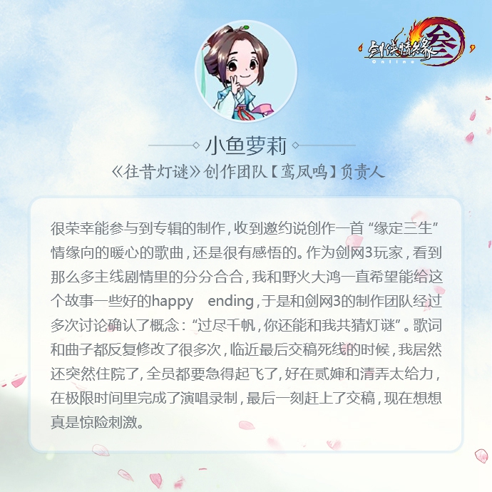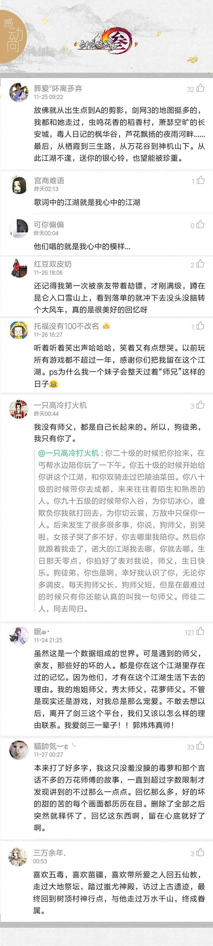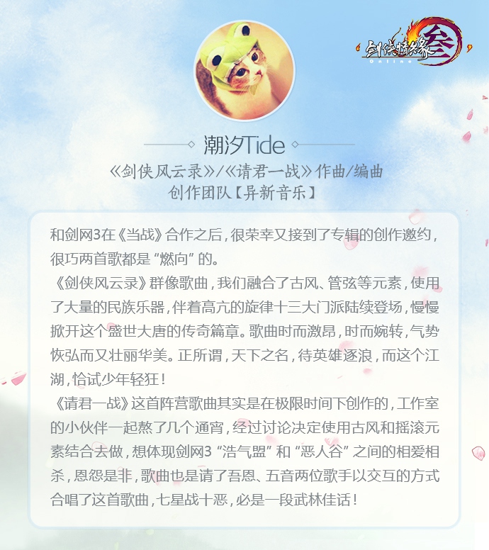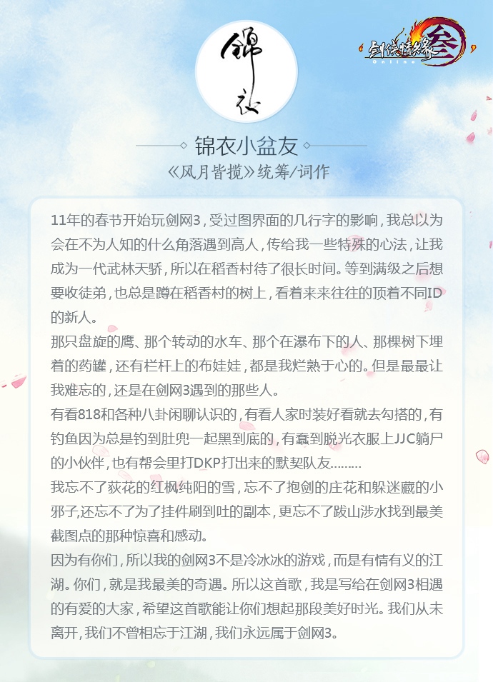 《剑网3》首张官方音乐专辑《剑歌江湖》数字版11月24日上线后,不仅创下首日销售75万首的辉煌战绩,更是在本周将销量攀升达到了130万。在众多侠士的热爱和鼎立支持下,《剑歌江湖》刷新了多项中国游戏音乐专辑销量的全新记录,《剑网3》也堪称当之无愧的超人气国风IP品牌。那么创下如此佳绩的《剑歌江湖》究竟听起来如何呢?一起来看看大家是怎么说的吧! 欢迎支持正版音乐专辑: QQ音乐: https://y.qq.com/m/digitalbum/gold/index.html?_video=true&id=3279462&g_f=gamebanner 酷狗: http://zhuanjistatic.kugou.com/html/mobile_commonchargeV3/index_ki_102266.html?is_go=1&hreffrom=80 酷我: http://vip1.kuwo.cn/fans/fanss/template2/index.html?key=jxqywlb20171124&fromkw=share&r=0.4265729957676212&from=singlemessage&isappinstalled=0 【玩家热评】 【音乐专辑部分创作团队感言】 作为超人气国风品牌,《剑网3》多年来一直深耕于弘扬传统文化和古风原创歌曲创作,奉献了众多耳熟能详脍炙人口的经典歌曲,在海内外享誉盛名。这些成绩都离不开众多音乐创作者以及广大剑网3侠士的鼎立支持和热情相助。《剑网3》游戏音乐今天所取得的荣耀与诸君共享! 《剑歌江湖》为《剑网3》官方独家携手腾讯音乐娱乐集团(TME),在其旗下的QQ音乐、酷狗音乐、酷我音乐三大音乐平台发售,AB双碟定价20元。二十四首古风天籁,与君携手梦回大唐。 《剑歌江湖》为双碟装版,“A碟·江湖曲”由国内一线民乐大师亲自操刀创作,全门派背景音乐将以全新方式创新演绎,让熟悉的旋律引领大家重新走上那段江湖旅程,更有《剑侠》《情缘》两首原创印象民乐新作,传递全新情怀与感动。 “B碟·踏歌行”由九大有爱原创音乐团队全力制作,二十六位人气歌手倾情演绎!以章节性的形式为大家讲述充满回忆与感动的《剑网3》故事,其实每一首歌,都是侠士游戏历程的写照。从稻香村开始,拜入门派,出师满级念师恩,亲友逗比闹江湖,或闲云野鹤浮生若梦,或热血阵营叱咤风云,或缘定三生佳偶天成,不同阶段的不同历程,共同见证了一段段江湖传奇的开始!有幸相遇,就是最美的奇遇! 为感谢全体大唐侠士对于《剑网3》游戏音乐的支持,今后《剑网3》更将以十二分的努力和付出创作出更多的动听旋律!同时也将发布更多《剑网3》文化衍生,以回馈侠士厚爱,敬请期待! 了解更多相关信息,请前往http://jx3.yzz.cn/ |