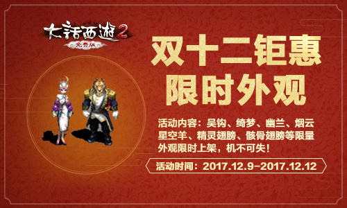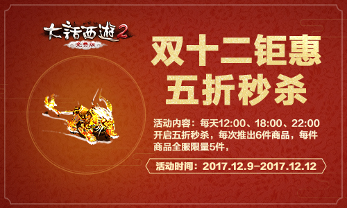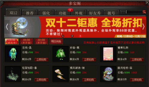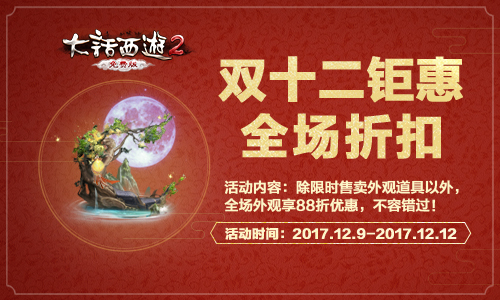 双十一过了,还有双十二!12月9日至12月12日,《大话西游2免费版》多宝阁开启双十二狂欢,三重福利火热来袭,五折秒杀、限时外观、全场折扣惠动人心,不容错过! 五折秒杀 先到先得 12月9日至12月12日期间,每天的12:00、18:00、22:00三个时间点,《大话西游2免费版》限量抢购活动火热开启!每次抢购会发布6件商品,类型包括了男衣、女衣、座驾、装饰品、特效、足迹和好友秀。每件商品全服限量5件,抢购价格低至5折,先到先得,抢完即止! 限量外观 限时上架 12月9日至12月12日期间,《大话西游2免费版》将限时上架多款备受好评的限量外观,包括吴钩、绮梦、幽兰、烟云、星空羊、精灵翅膀、骸骨翅膀等多个系列。仅售四天,各位若是喜欢,这次可千万不要错过了! 全场折扣 不容错过 12月9日至12月12日期间,《大话西游2免费版》多宝阁开启全场折扣福利,除了特定限时售卖的外观道具之外,购买任意外观道具,均可享受88折优惠,机会难得,不容错过! 了解更多相关信息,请前往http://dh2.yzz.cn/ |