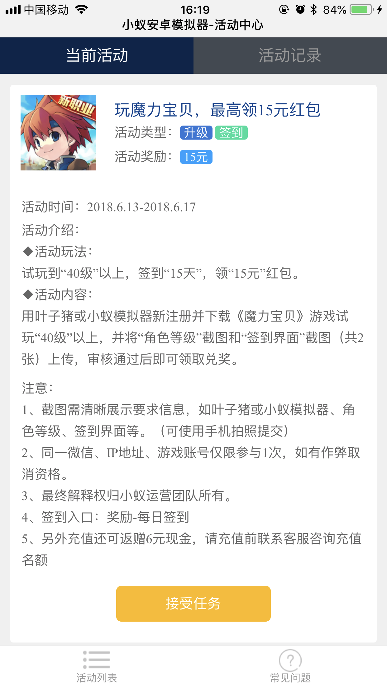 看直播的小伙伴一定看到过,某某某主播新买的小号,没过多久就已经满铭文了!然后就是一幕幕满铭文号在黄金铂金局对线时大屠杀,毕竟150等级的铭文属性优势太大了。每当这个时候看着自己的王者号还是130多等级的铭文就在想,土豪就是不一样!不过最近我发现了一个可以让大家不用自己充值也可以像某主播那样迅速获取150等级铭文。 接下来是我的测试流程,都给我仔细的看好了! 1. 首先需要关注小蚁微信公众号(xiaoyimnq) 免费领取的入口就在公众号左下角的菜单栏,个人建议关注最好,不然每次都需要去找活动入口,浪费青春。 直接扫码关注公众号最方便 2. 通过微信公众号的菜单栏左下角入口进入活动界面 3. 接取相应的游戏任务 接取任务的时候我是一次性把能接的都接了,毕竟没谁会和钱过不去,顺便说一下 貌似任务是有限时接取的,所以大家能接的一定要全部接了。模拟器多开不正好可以一下同时完成多个任务吗?嘿嘿~ 4. 下载对应的游戏 为了节省时间,我建议大家可以同时把所有任务游戏都下载下来,或者用模拟器多开之后,每个模拟器都下载一两个,然后同时进行任务。 5. 按照任务的要求玩游戏 每一个游戏的要求都不一样,我总结了一下,大概有签到、升级、首充等三类,下载下 来的游戏按要求进行任务即可。不过每个任务都是几分钟就能完成的,就算是签到任务也是每天登陆一下签到就行,这不就是躺着赚钱吗? 6. 手机拍照上传审核 任务完成后,直接用手机截图或者拍照上传截图,然后提交审核就可以了。话说我第一次不怎么熟练,稍微多折腾了几分钟,但是同时完成了四个6块的游戏任务,总共也才花了六七分钟。心里美滋滋! 虽然我步骤写得比较详细,看着复杂,但是实际上很简单,轻轻松松便可获得奖励,拿到奖励后的我迫不及待的进行充值了一波王者荣耀点券,心情别提有多爽了,关键是不心疼,赶紧铭文走一波! 我该去继续接几个任务去了!有缘再见~ |