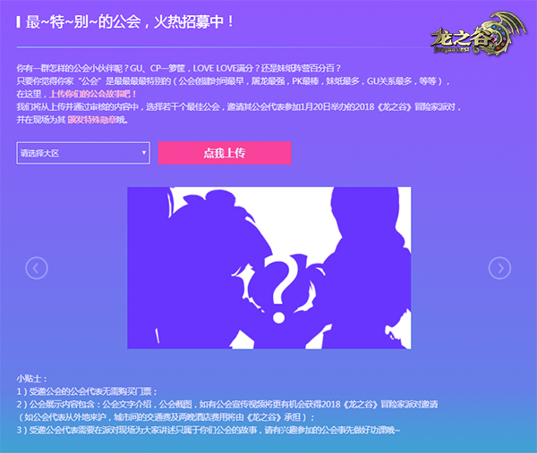 双12未至,阿尔特里亚大陆上的气氛在最近却已经high了起来。12月4日,《龙之谷》曝光了即将在明年1月20日举办的2018《龙之谷》冒险家派对主题站,2018年更新内容爆料、明星大咖云集的音乐会、PK大赛,还有互动体验小游戏以及海量周边等等,应有尽有。这场千人规模的属于谷迷的线下盛事,将在新年伊始就为大家带来最劲爆的全民大狂欢!而就在今天下午,更是将迎来手速与热情的大碰撞——售票通道,即将开启! 2018《龙之谷》冒险家派对主题站直达>>> VIP票14点开售 普票15点开售 2018《龙之谷》冒险家派对作为《龙之谷》史上首届千人级线下狂欢派对,本次采取售票制,玩家可通过《龙之谷》官网的团购平台进行购票。在14点,VIP购票通道将优先开启(VIP票售价29800点券),15点时,普票购票通道也将开放(普票售价12800点券),大家可以凭自己的喜好来选择购票。记得定好闹钟,不要错过这场ALL DNer的炒鸡特殊的聚会,先到先得哦! 购票即赠千元级宠物 还有限量新款周边送 除了秉承让大家在派对现场看好、玩好、吃好的精神,在购票时,《龙之谷》更是放出了重磅礼包大招。无论是VIP票还是普票,只要购买了2018《龙之谷》冒险家派对的门票,就可以在活动结束后获得超可爱的千元级独角兽宠物,还有为此次派对专门定制的新款小喵和重磅鸭周边玩偶,也将随机出现在现场人手一个的展会礼物袋内。不过除了部分相同的权益外,VIP票用户的专属特权也是超赞的:入场快速通道,舞台观摩优选座位,艾琳时装,卡哇伊100%的羊咩咩数据线。BUT,VIP票限量200张,加油吧谷迷们!现场玩游戏集章达到指定数量,还有超Q的重磅鸭搪胶挂件可以赢取,回头率杠杠哒! 我们准备好了灯光和舞台 来说出你们的公会故事 在今天下午,2018《龙之谷》冒险家派对主题站内的公会招募通道也将正式开启投稿功能。你们的公会是传说级老牌公会吗?是屠龙最强,PK最棒?还是满公会里都是雌性荷尔蒙爆炸的妹纸ONLY公会?只要你的公会与众不同,记得参与公会招募。入选公会的公会代表将可免费参加本次派对,并获赠特邀谷迷票,可以获得与VIP票相同的游戏内道具以及新款实物周边等VIP权益哟! 今日14点,售票通道开启,购票即赠超值礼包。定好闹钟,记得开抢哦!2018年1月20日,《龙之谷》冒险家派对邀你一起——不浪不罢休! 《龙之谷》“百兵之王·觉醒”版本更新! 萌骑士终迎觉醒!机动提升攻击更强大! 95级装备开二阶!属性成长能力获蜕变! 宴会厅和狩猎日!战斗升级勇者夺奖励! 贝勒尼卡变身套!集齐六件变市长大人! 感恩节线上活动!轻松参与也有好礼拿! 了解更多相关信息,请前往http://dn.yzz.cn/ |