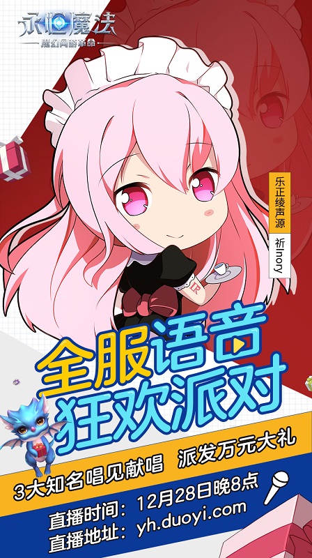 永恒好声音?魔幻网游革命《永恒魔法》全新内容“魔域龙影”现已盛大开启,全新十人副本难度翻倍,携友同行体验开荒式团本乐趣;和风温泉唯美上线,特色互动引领社交新玩法;双旦活动欢乐上线庆祝佳节,圣诞限定时装免费兑换。12月28日晚8点,《永恒魔法》首个语音狂欢派对惊喜来袭,知名唱见强势加盟,为你带来声音的盛宴! 【听觉享受 狂欢派对唱见来袭】 年末终极狂欢!《永恒魔法》首个全服语音狂欢派对将于12月28日晚8点火爆开启,全程多次抽奖,总计万元大奖等你来拿!狂欢节当晚,将有三名知名唱见降临活动直播间,他们分别是王胖子、祈Inory和少年霜,极力打造永恒好声音! 祈Inory身为知名动漫歌手,同时也是Vsinger旗下的虚拟歌手乐正绫的声源。甜美又极具辨识度的声线和具备透明感的高音深受听众喜爱,曾为多部动画及游戏作品演唱主题曲。毕竟是乐正绫声源,相信大家也是对这位CV非常熟悉的了。 CV王胖子为月声配音社CV,同时也是B站知名翻唱UP主,代表作有《万物死》、《故人叹》、《牵丝戏》等,常年出没于动漫音乐节和各种二次元活动,也许你没见过他,但可能歌单列表就有他的作品! 少年霜为知名音乐博主和音乐视频自媒体,其百变声线吸引了不少听众。代表作为《怪兽大作战》、《梦回小桑村》等,同时也是漫画《星梦偶像计划》卢蕊的配音。 【互动有奖 壕礼送不停】 狂欢派对直播页面上线之后,玩家即可到页面参与抽奖。通过完成超级简单的指定任务,比如分享、注册、下载等动动手指即能完成的任务,就能获得抽奖机会。12月28日晚8点进入直播间,与唱见大大们、美女玩家一起欢乐互动,就能参与抽奖,千元京东卡、豪华外设、海量游戏礼包疯狂派送! 【不一样的乐趣 全新内容上线】 《永恒魔法》全新内容“魔域龙影”现已全面开放,极具挑战的全新十人副本震撼登场,难度逆天让人瑟瑟发抖;温泉玩法悄然上线,在这个冬季带给你暖心体验;双旦活动喜庆开启,还可以免费兑换限定圣诞时装!全新内容带给大家不一样的游戏乐趣,等你体验! 今年最后一个月也要嗨到最后,《永恒魔法》全新内容不仅有新挑战,还有新乐趣、新福利,月底语音狂欢派对更是誓将快乐进行到底,亲密互动拿大奖,年末收获满满! 关于《永恒魔法》: 《永恒魔法》是多益网络最新研发的纯正魔幻冒险RPG,开启一个巨龙与天使并存的魔幻史诗世界。《永恒魔法》包含影视级流光视觉画面、6大职业多姿态自由切换、组合式变形定制技能、动作感十足的交互式副本、多维度热血大战场、奇幻萌动的宠物等特色。让玩家享受与好友兄弟,一起战斗竞技、热血开荒、探索世界的乐趣,体验一场非凡的自由冒险之旅! 了解更多相关信息,请前往http://game.yzz.cn/html/info-2153.html |