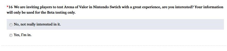 《王者荣耀》即将登陆Switch平台,腾讯为游戏的的beta测试公布了一份面向欧洲玩家的问卷调查,内容都为英文,并且完成问卷就有机会参与到测试中来。 问卷内容包含一些常规问题,调查了玩家的平时游戏习惯、平台,是否玩过Moba,喜爱的Switch游戏以及玩家对于《王者荣耀》的各方面内容喜好,问卷最后提到团队正在寻找玩家,参与Switch版《王者荣耀》的b测,你是否有兴趣,并且会留下你的邮箱以供后续联系。 如今尚不知道Switch版《王者荣耀》的最终上线日期,敬请期待。 |