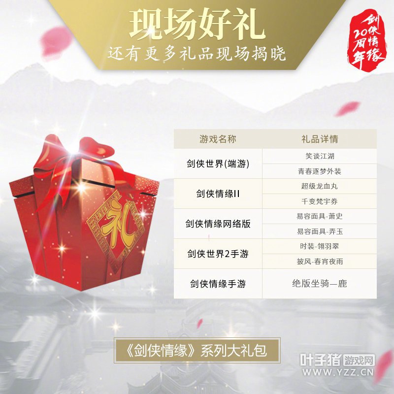 剑侠情缘20周年庆典今日盛大开启 14家直播平台全力护航 剑侠情缘20周年庆典今日19:00在广东珠海大剧院盛大开幕,韩红领衔众星倾情加盟,重现经典;诸多剑侠大神共聚江湖,揭秘幕后故事;剑侠IP集群首秀,海量内容揭晓;跨界文化合作、粤剧新作亮相助阵;外场主题展台,精彩活动不断;现场还有豪礼相赠,剑侠系列礼包诚意回馈;全平台多家直播媒体全力护航,全程现场直播,共同欢度江湖盛典。 看点一: 群侠聚集 从1997年至2017年二十载春秋,剑侠情缘系列历经单机、网游、手游三大时代, 不断推陈出新,诞生了十余款游戏。庆典现场金牌制作人回顾剑侠系列游戏制作历程,众多剑侠大神将揭秘游戏幕后经历,追忆江湖路,分享他们的剑侠情缘故事,还有惊喜内容现场首曝。 看点二:众星加盟 众多明星倾情加盟现场,著名歌唱家韩红,阿木、白梦等知名歌手,以及有着“剑侠音乐之父”的罗晓音将重现经典,再续前缘,共贺剑侠20周年。届时,老朋友共聚一堂,经典剑侠歌曲《剑侠情缘》、《大英雄》、《笑问情缘》将在珠海大剧院再度回响。还有顶尖音乐团队、知名COS团队、配音团队、有爱视频团队等众多人气同人嘉宾也将来到现场,助阵庆典。 看点三:IP计划 西山居游戏秉承“非物质文化+互联网文化”融合的创新理念,开创游戏文化与中国传统文化合作的先河。在泛娱乐领域、电子竞技赛事、文化衍生等环节内容亦积极探索, 推出影视、粤剧、音乐专辑、小说等多种形式文化作品。西山居COO郭炜炜将携各团队主创和合作伙伴在20周年现场登台亮相,展望未来的全新征程。诸多IP衍生内容集群首秀,音乐、影视、动画、舞台剧等海量惊喜内容接力曝光。 看点四:文化传承 西山居游戏跨界联手广东粤剧院推出粤剧《决战天策府》,传承世界级非物质文化遗产,国家一级演员彭庆华老师将亲率团队加盟现场,更有神秘新剧曝光。还与国礼级品牌“万事利”合作,共同打造高品质衍生文化产品,央视《百家讲坛》讲师、万事利董事长李建华老师也将助阵庆典,敬请期待! 看点五: 好礼相赠 西山居游戏与G20国礼级品牌“万事利”深度合作联手打造周边——鹤影天青•国风团扇,该团扇采用真丝欧根纱面料,融合莲花、云纹等国风元素,制作工艺精良,侠士抵达庆典现场即有机会可得。更有剑侠情缘系列礼包及剑网3周年系列挂件暖心诚意回馈。侠士可从《剑网3》五周年挂件“九霄环佩”,六周年挂件“夜幕星河”,七周年挂件“江湖画扇”,八周年挂件“山海间”任选一件。 看点六: 外场主题展 剑侠情缘20周年庆典当天,外场将开启主题展,为各位大侠准备了丰富的场外活动。剑侠情缘丰富跨界文化、游戏文化、同人文化展出,线下寻亲、AR趣味互动同步开启,还有官方周边售卖,一起来约吧! 看点七:全平台直播 此次庆典全平台多家直播媒体全力护航,邀你共庆剑侠情缘20周年。熊猫直播、B站直播、斗鱼直播、虎牙直播、全民直播、龙珠直播、战旗直播、触手TV、天天快报、企鹅电竞、小米直播、小米电视、乐视、火猫直播等14家媒体全程直播现场盛况,感谢以下媒体平台对此次庆典的大力支持。 剑侠情缘二十载,初心不负江湖路。 感谢诸位侠士一路相伴! |
