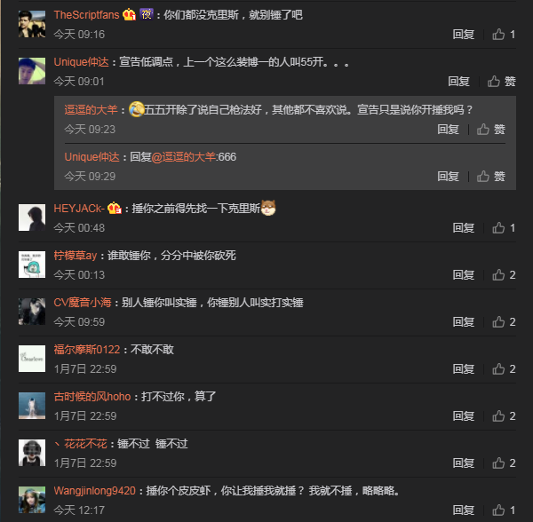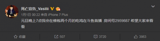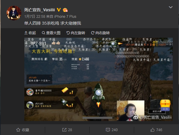 死亡宣告在去年因为直播中的事故被Newbee俱乐部解决解约,随后LOL赛事官方也宣布将其禁赛至2020年,至此彻底远离了英雄联盟。今年元旦,死亡宣告微博宣布复播,并和观众解释了当时只是砸了一些东西,并没有殴打女友。 从死亡宣告近一个星期的直播中可以看出,他在绝地求生中同样也有很高的天赋,1月7日更是35杀实力吃鸡。对此死亡宣告发布微博:单人四排,35杀吃鸡,求大佬锤我。看得出他对自己的表现也是比较满意的。 面对死亡宣告的求锤,网友们的回答都很一致:不敢锤、不敢锤,没有克里斯就别锤了吧。 第一个出来锤宣告的是他女朋友:其实是我操作的。面对这个回复,一位网友说:下次告哥玩吃鸡的时候,千万别多嘴,不想看到告哥连吃鸡都播不了。 看来死亡宣告和女友真的已经和好了,大部分网友也表示接受死亡宣告回归直播,同时希望死亡宣告以后能改掉自己暴躁的脾气,不要浪费了自己的游戏天赋。 |