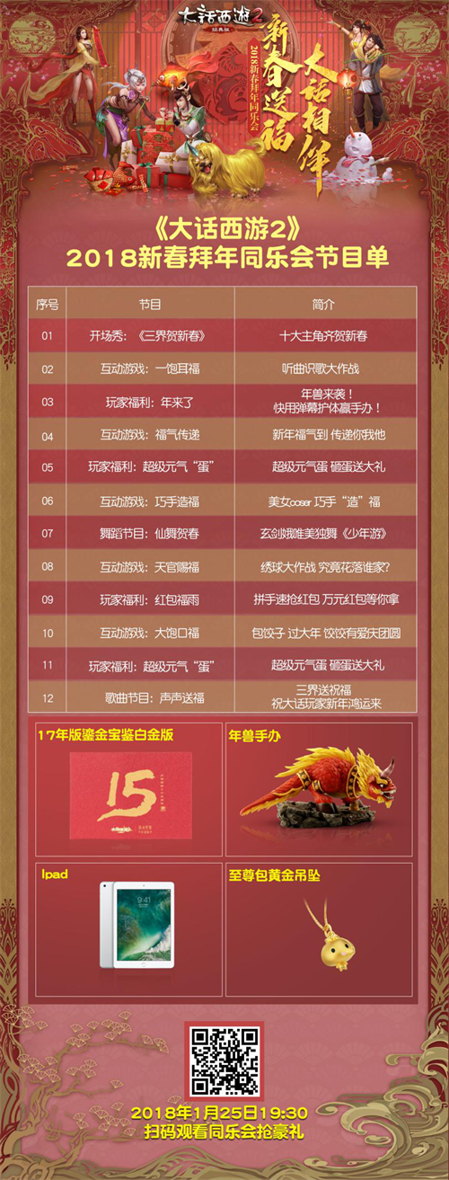 新春送福,大话相伴!今晚19:30,大话西游2首届新春拜年同乐会将喜庆来袭,开启线上直播,用更新颖、更欢乐的拜年方式,与大家共迎新春。红拂女、玄剑娥等十大coser齐聚给你拜大年,参与直播互动更有iPad、至尊包黄金吊坠、2017鎏金宝鉴、年手办、新春红包等多重好礼情义相送! >>2018新春拜年同乐会直播链接:http://xy2.163.com/2018/home/#bn 十大coser助阵 同场趣味比拼 今晚19:30,大话2将首次以直播的形式给大家拜年,2018新春拜年同乐会将为大家带来精彩的表演节目,以及趣味的互动游戏。红拂女、玄剑娥两位深受玩家喜爱的coser将担任队长,带领逍遥生、无涯子、小蛮妖、云中君、狐美人、燕山雪、祭剑魂、飞剑侠,分成2队进行趣味游戏比拼。十大coser同场竞技,你希望哪些角色能够同在一支队伍里并肩作战呢?他们将给大家带来怎样的精彩节目,又将在比拼中碰撞出怎样的火花?妙趣横生的节目内容,今晚即将上演,千万不要错过! 多重互动福利 送出喜庆好礼 大话2首届新春拜年同乐,除了十大coser将同台表演精彩节目,与大家欢聚开怀外,还将通过多种互动游戏,为大家送上丰厚福利,给你一份最特别的新春大礼。 福利1——弹幕互动,直播中参与弹幕互动的玩家朋友,将有机会获得珍藏版年手办一个。 福利2——新春红包,6666元新春现金红包,将化作喜庆红包雨来袭。 福利3——金蛋大礼,直播现场将有两次开金蛋环节,内含iPad和至尊包黄金吊坠,大礼将在今晚由红拂女和玄剑娥亲手开启,送给观看直播的玩家! 福利4——投票抽奖,2017白金版鎏金宝鉴也将在直播结束后抽出,大家可以在直播的同时给自己看好的队伍投票,猜测哪支队伍最终将获得胜利,直播结束之后将在猜中的玩家中抽取一位送出鎏金宝鉴! 最后附上今晚的节目单,大家千万别错过这一场福利多多的视听盛宴哦! |